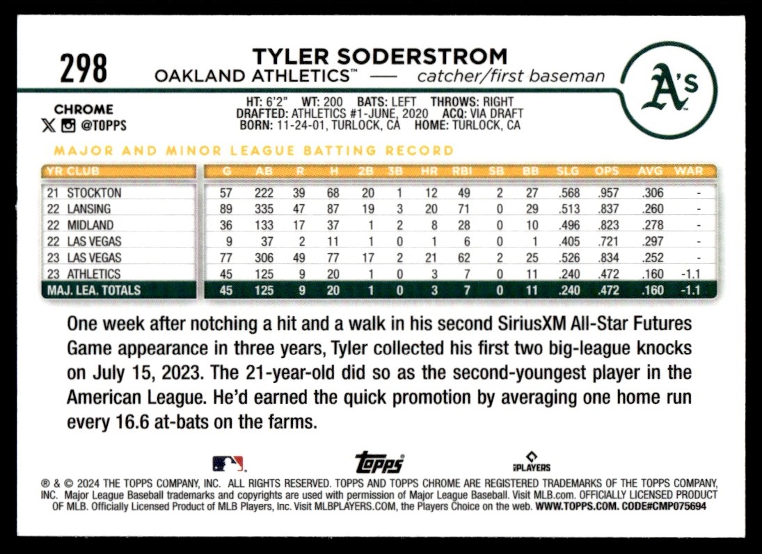 2024 Topps Chrome Prism Refractor Tyler Soderstrom Rookie Oakland Athletics #298