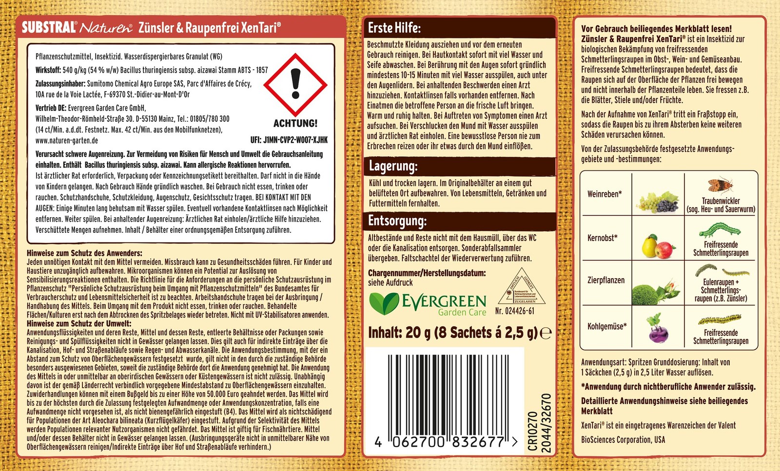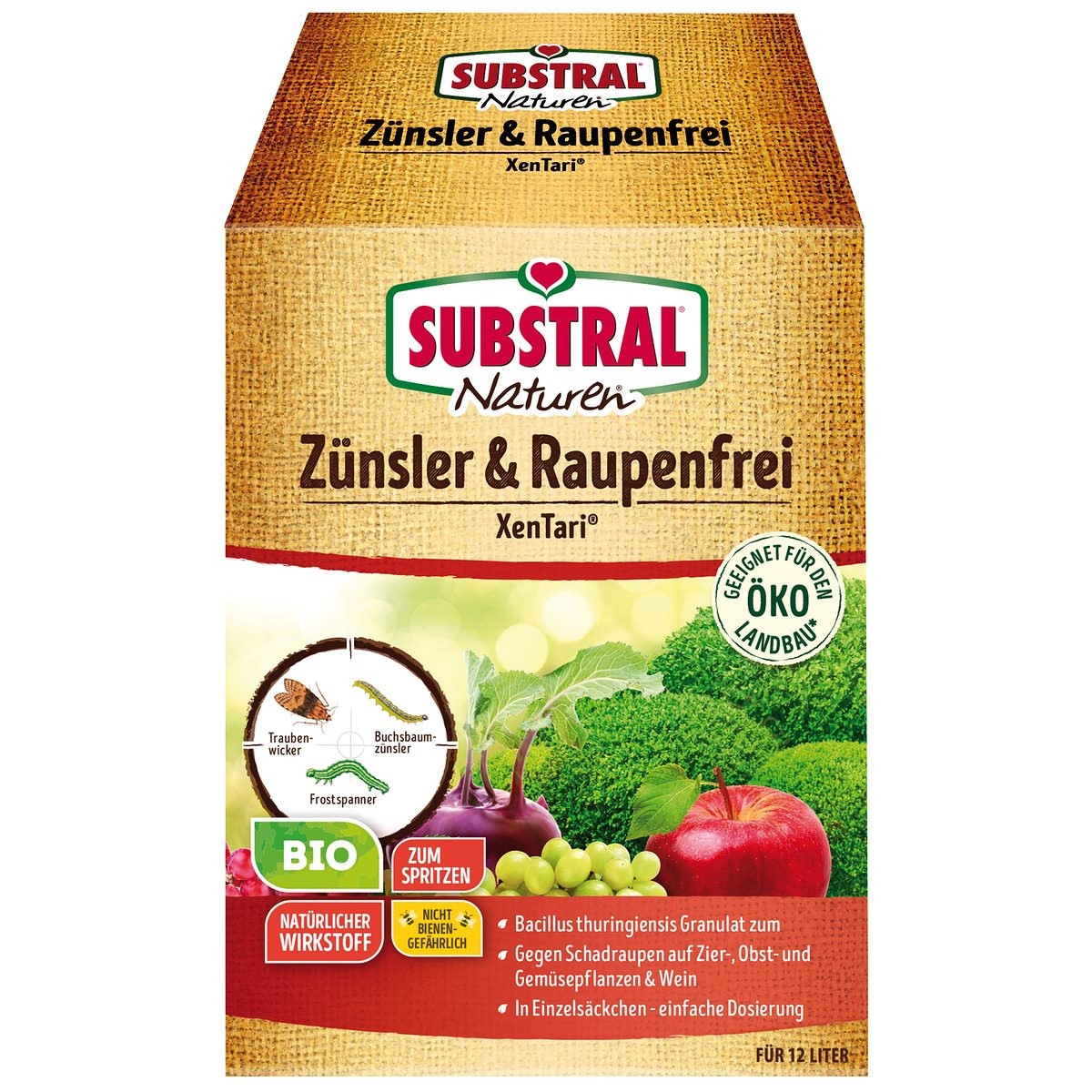 „SUBSTRAL® Naturen® Zünsler & Raupenfrei XenTari ist ein Insektizid zur biologischen Bekämpfung von schädigenden, freifressenden Schmetterlingsraupen im Obst-, Wein- und Gemüseanbau.