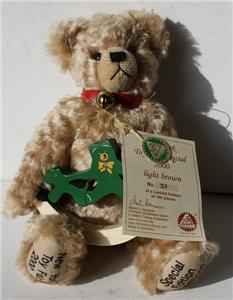 Here is a great Special Limited Edition 2000 New York Toy Fair Golden Curly Mohair with wooden toy Teddy Bear dog on a rocker This one is #37 of 100 has stitched and shaved nose Also has Red Collar with bell and has Green Foil hang tag and certificate and metal Hermann tag on the back of the head and is also embroidered on both feet Specail Edition German Made Teddy Bear. It is Adorable. It is marked with tag and certificate-SEE ALL PHOTOS. It measures about 10 inches tall by about 5 inches wide. This is just one of the many Teddy Bears I will be listing I have to down size my collection just running out of room I have been told I have a "Bear Problem". Let my loss be your gain. Grab this great vintage collectible Hermann Teddy Bear while you still can it will not last long.