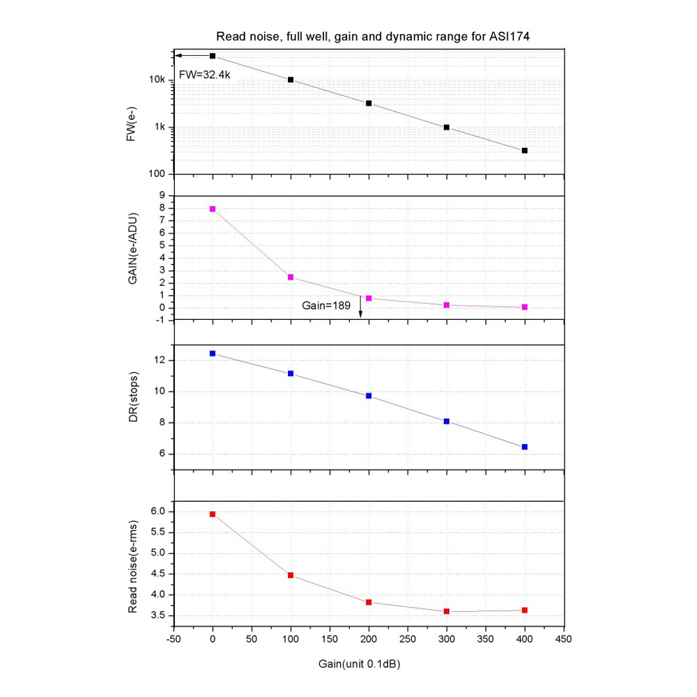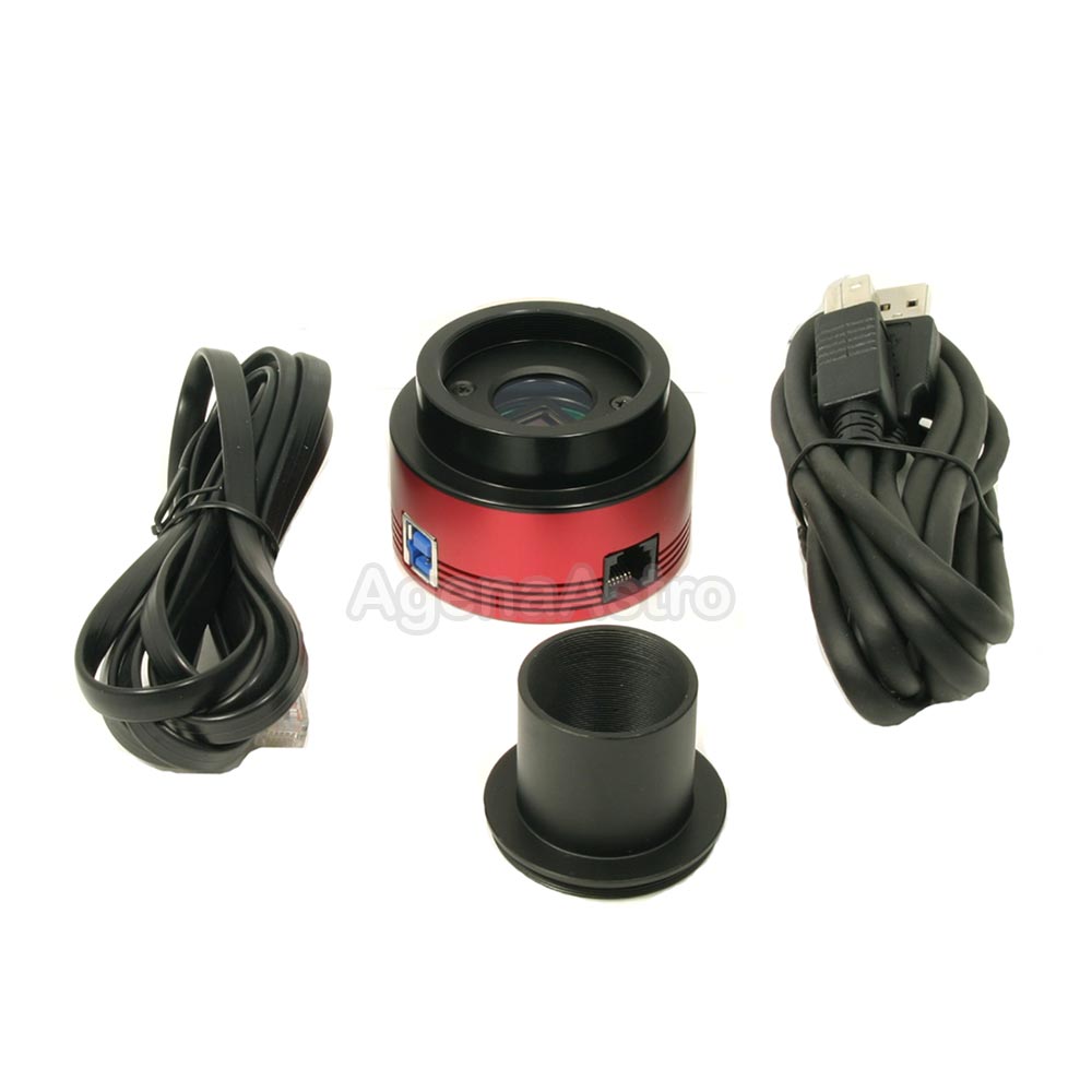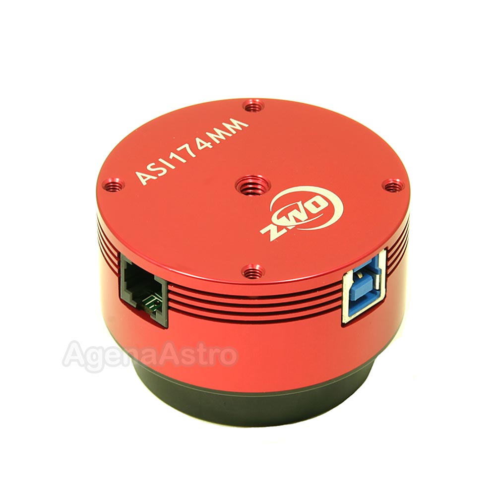The ZWO ASI174MM is a sensitive and state-of-the-art monochrome astronomy camera with 2.35 megapixel resolution and USB 3.0 download speed. Built around the Sony IMX174 sensor, this advanced camera has a resolution of 1936x1216 with 5.86 μm pixel size. It's ideal for high-resolution imaging of the Moon, Sun (with proper solar filter), and planets, as well as brighter deep-sky objects. The heart of this monochrome camera is a Type 1/1.2 CMOS sensor with 13.4 mm diagonal. With a quantum efficiency (QE) of 78%, this advanced sensor incorporates Sony's Exmor technology that enables high-speed processing, low noise, and low power dissipation using column parallel A/D conversion. The IMX174 sensor also uses Sony's Pregius Global Shutter function with analog memory to permit the scanning of all pixels simultaneously. This improves image quality by ensuring images of moving objects avoid focal plane distortion, a feature which is especially helpful when performing solar or lunar imaging during moments of wind and bad seeing. The sensor shutter technology and fast USB 3.0 interface on the camera allow transfer rates of up to 164 frames per second at full 1936x1216 resolution. At reduced resolution of 640x480, download rates up to 397 fps become possible. Using the sensor's ROI (Region of Interest) mode, which lets you capture up to 16 areas inside the effective pixels, even higher frame rates are possible. The camera enables exposure times of 32 μs to 300 s (5 minutes). The ASI174MM has a robust and attractive CNC machined red-anodized aluminum body that stands up to heavy field use. An AR-coated glass window protects the sensor and helps keep images sharp. A 1/4-20 thread in the bottom of the camera makes it easy to attach the device to a camera tripod or mount, and four M4 threads along the outside edge offer additional mounting options. This camera can be configured with the following connections for attachment to telescopes and imaging