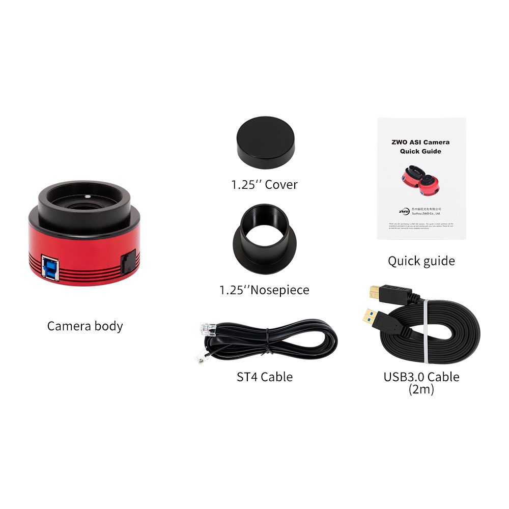 The ZWO ASI174MM astronomy camera can be used on just about any telescope. A M42-threaded 1.25" nosepiece, and a 1.25" cover also come with the camera. When used for autoguiding, the camera can also work with Maxim DL or PHD when guiding with long exposures. ZWO has phased out software CDs, but this camera comes with instructions to download the required control software and drivers directly from the ZWO website. Camera Technical Details