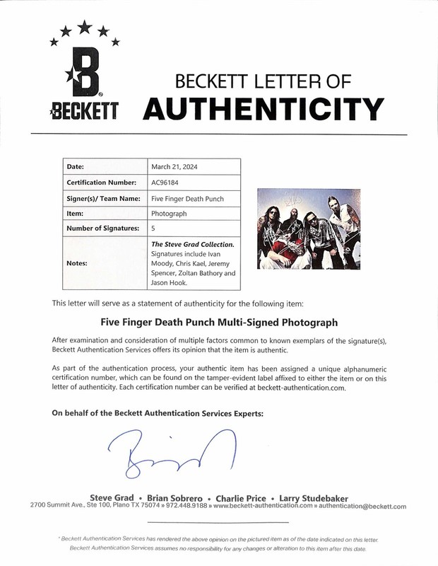 Autographed 11x14 color photograph signed in silver paint pen by Five Finger Death Punch. Signatures include Ivan Moody, Chris Kael, Jeremy Spencer, Zoltan Bathory and Jason Hook. From the Steve Grad Autograph Collection and obtained in person by Steve Grad Sept 2015 in Portland Oregon. The autograph has been authenticated and is accompanied by a full LOA by Beckett Authentication services #AC9618