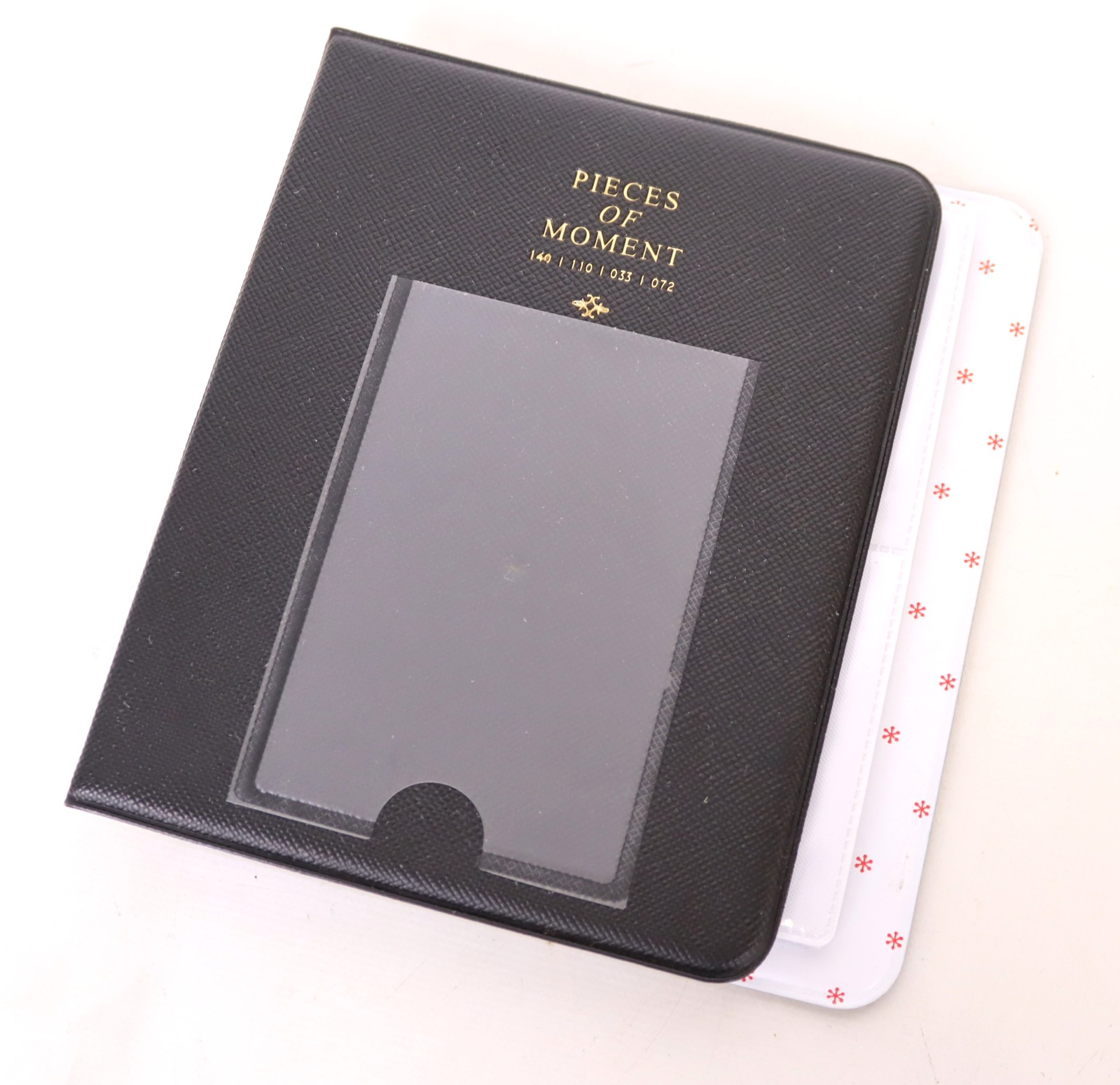 • Sewn leatherette cover with a frame to insert a favorite Instax or Polaroid credit card size instant print