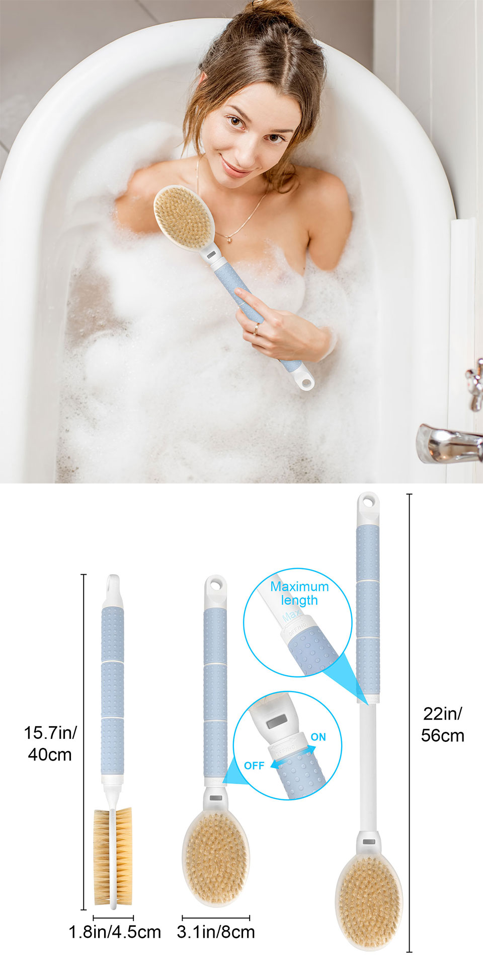 Telescopic long-handle shower brush with dual-sided bristles for gentle exfoliation and deep massage. Extendable non-slip handle allows easy back scrubbing. Made of eco-friendly materials for daily skin care and improved circulation.