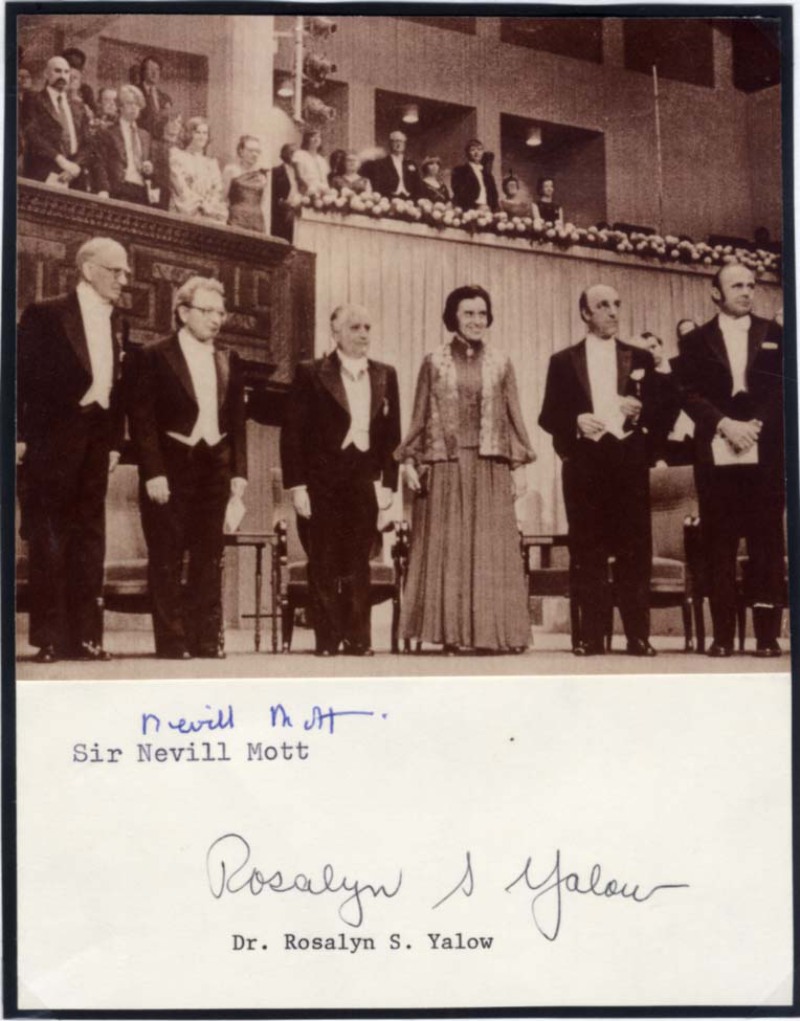 Signed card - affixed with a photograph on cardboard, 5 x 6,5 inch, signed by both in ink "Nevill Mott" & "Rosalyn S. Yalow", with very mild signs wear - in nearly very fine condition.