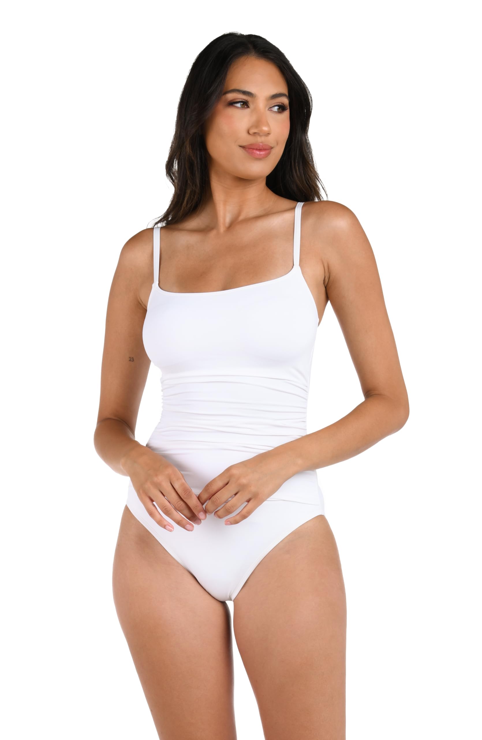 FEATURES AND DETAILS - Thin over the shoulder, adjustable straps. Sleek scoop neckline. Straight back. Removable cups. Lined. Side and midsection shirring detail. High-cut sides, and full coverage bottom for a secure fit.