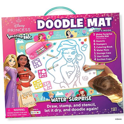 Reveal a rainbow of colors and create beautiful pictures using just water with Bendon's Imagine Ink Water Surprise Doodle Mat! Each kit comes with a 20-page coloring book, Water Surprise floor mat, suction cups, instruction sheet, and 5 water pens, 5 plastic stencils, EVA foam stencils, 6 rubber stampers in with a plastic case for endless mess-free coloring fun! This unique drawing experience lets children enjoy the act of painting and coloring without the messy spills! It’s perfect for a beginner – just add water and brush it on to fill the doodle mat with vibrant and bold colors.