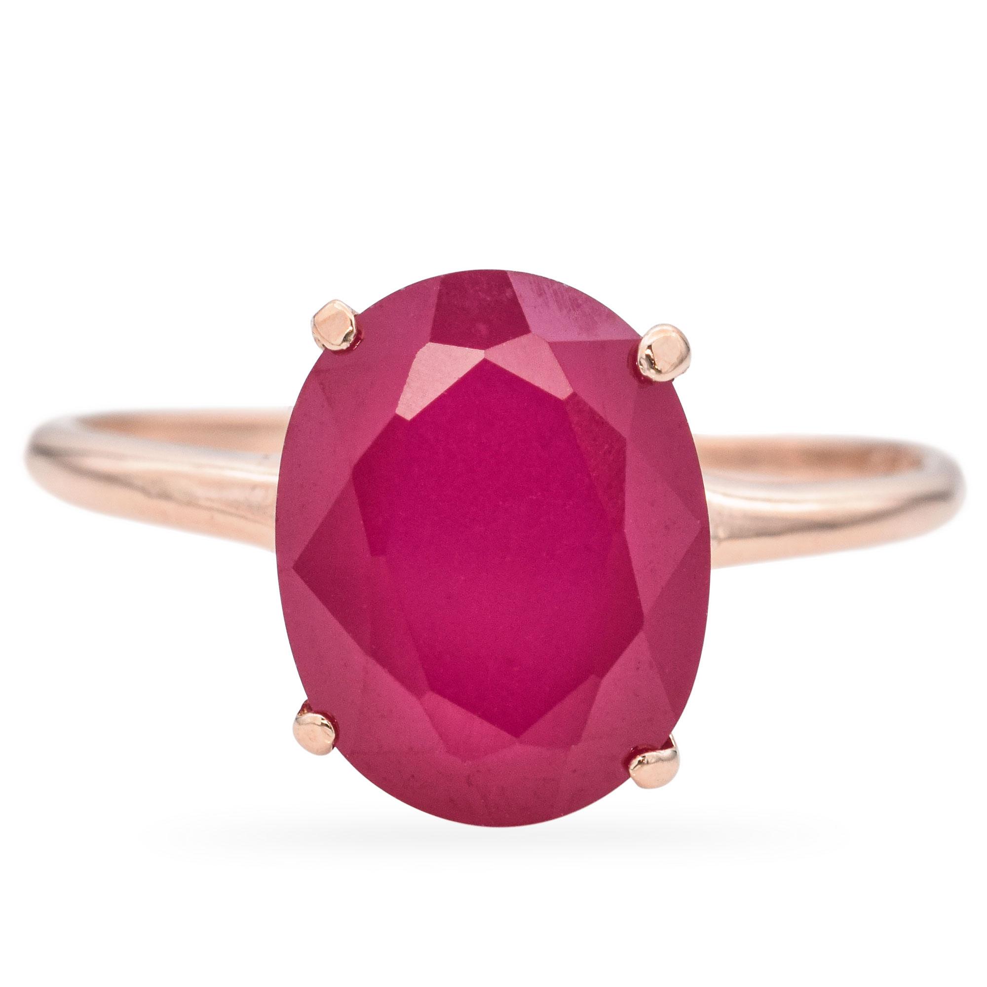 Crafted in 10k rose gold, the ring showcases a 3.6 carat oval-shaped ruby in a minimalist setting, allowing the stone's vibrant color to take center stage.