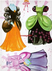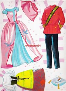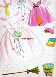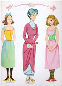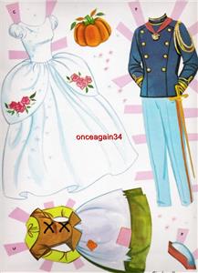 This is an excellent reproduction set! This nostalgic Cinderella uncut paper doll set was originally published in 1965. This pretty loose page laser reproduction is made from my original 1965 set (this is NOT the reduced size repro - please compare to incomplete sets available elsewhere). The set contains all of the dolls - Cinderella, the Prince, Anastasia, the Stepmother, Drizella, and all six pages of pretty colorful clothing fashions! I have shown the folder and all six pages of uncut clothing in the pictures above. The covers and dolls are on 80 lb cardstock, and the clothing pages are on quality 28 lb vintage weight paper similar to the original! This is a very nostalgic loose page reproduction set and it would be an excellent addition to a vintage paper doll collection! PLEASE CHECK THE COLORS ON MY AUCTIONS COMPARED TO OTHERS LISTED! THIS LOOSE PAGE REPRODUCTION SET IS THE ORIGINAL VINTAGE SIZE WITH THE ORIGINAL COLORS AND GRAPHICS THAT YOU REMEMBER FROM YOUR PAST!! ~ A WONDERFUL WAY TO BRING BACK THOSE OLD MEMORIES ~ YOU WILL NOT FIND A BETTER REPRODUCTION ANYWHERE - PLEASE COMPARE FOR YOURSELF AND SEE THE DIFFERENCE!