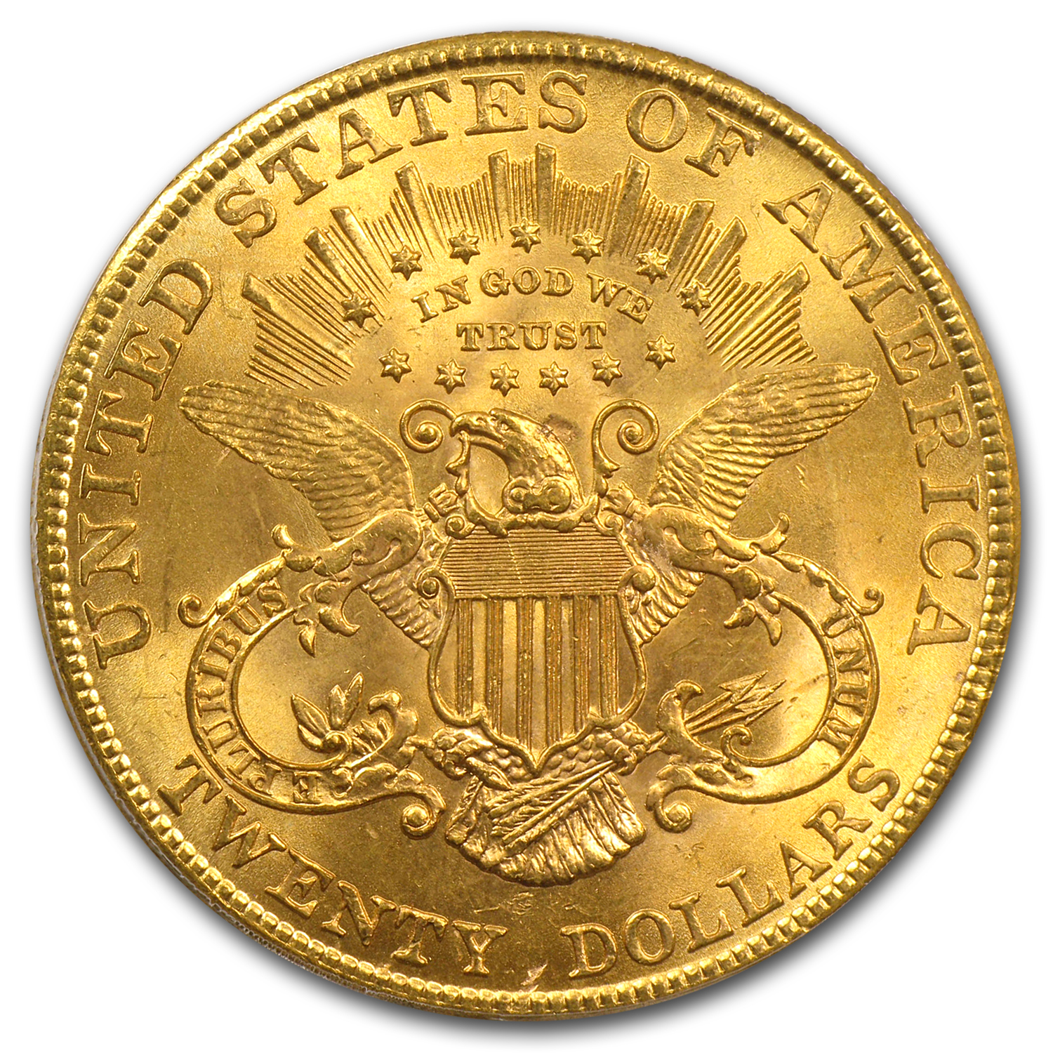 Minted through 1907, the Liberty Double Eagle coin contains .9675 oz fine gold, alloyed with copper to improve its durability and wear characteristics. The design, introduced in 1850 by designer James Longacre, is one of the most iconic, easily recognizable images in numismatics. Due to the high value of U.S. $20 Gold coins, many were kept in limited circulation and stored away in vaults, making high-grade coins surprisingly attainable given their age. Due to their limited circulation use, the coins offered here will show nearly full detail of this classic design.