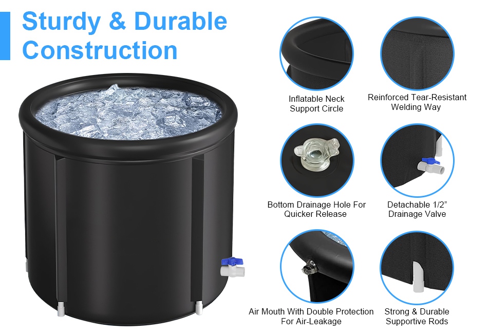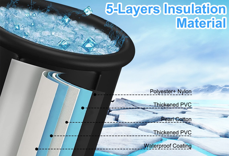 - 5-Layers Insulation Material:Featured with 5-layers insulation system:polyester+nylon/thickened PVC/pearl cotton/Thickened PVC/waterproof coating,our cold plunge tub ensuring an enhanced thermal shield to prolong your cold diving experience. With its sturdy and durable construction,it can withstand loads of up to 660lbs while the tear-resistant material guarantees a long-lasting lifespan.