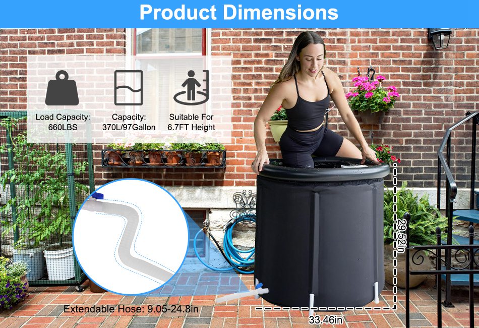 - 370L/97Gal Large Ice Bathtub:The dimensions of our 370L/97Gallon large ice bathtub are 33.46x33.46x29.52in,making it suitable for most adult body types and providing ample space for an upright sitting position and complete immersion in cold water therapy. It is recommended for people up to 6.7ft height.
