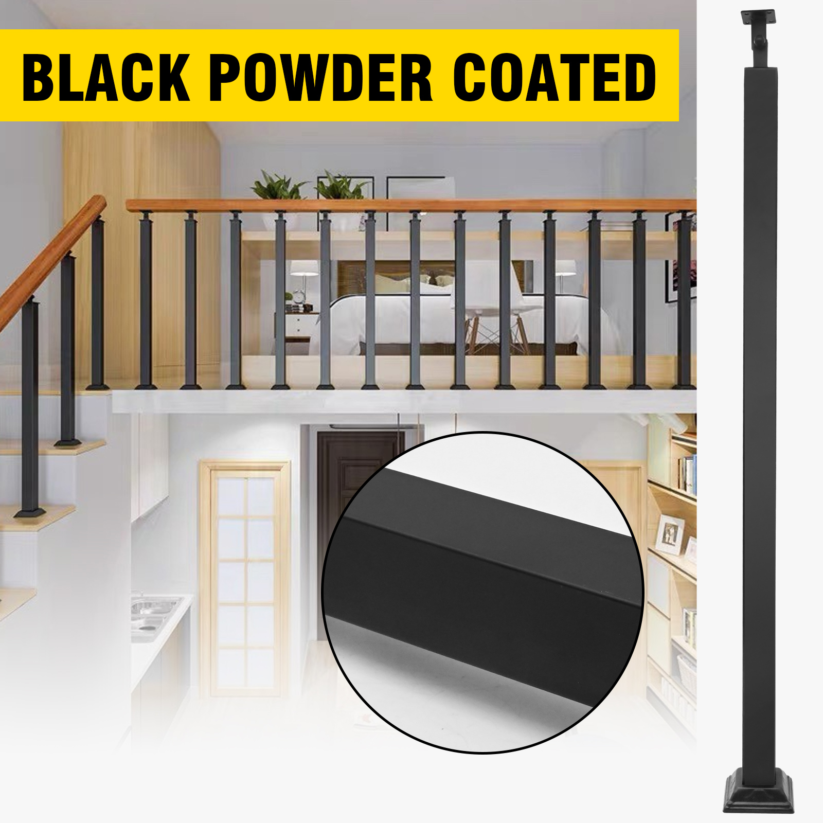 Our black square metal railing posts are made of high-quality thickened wrought iron, which is high-temperature treated and coated with an anti-rust coating for a beautiful appearance and stability. It is suitable for various indoor and outdoor decoration places, providing you with safety.