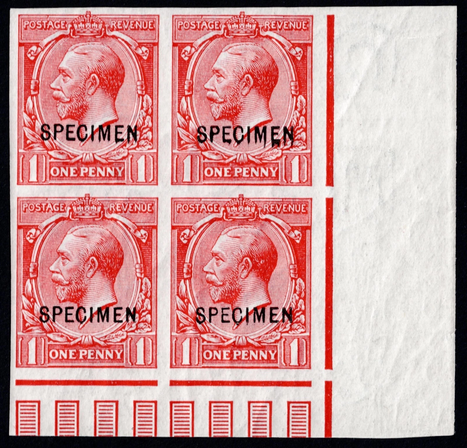 1912 George V 1d Scarlet Imperforate Block of Four Specimen Spec.N16(1)u SG 357