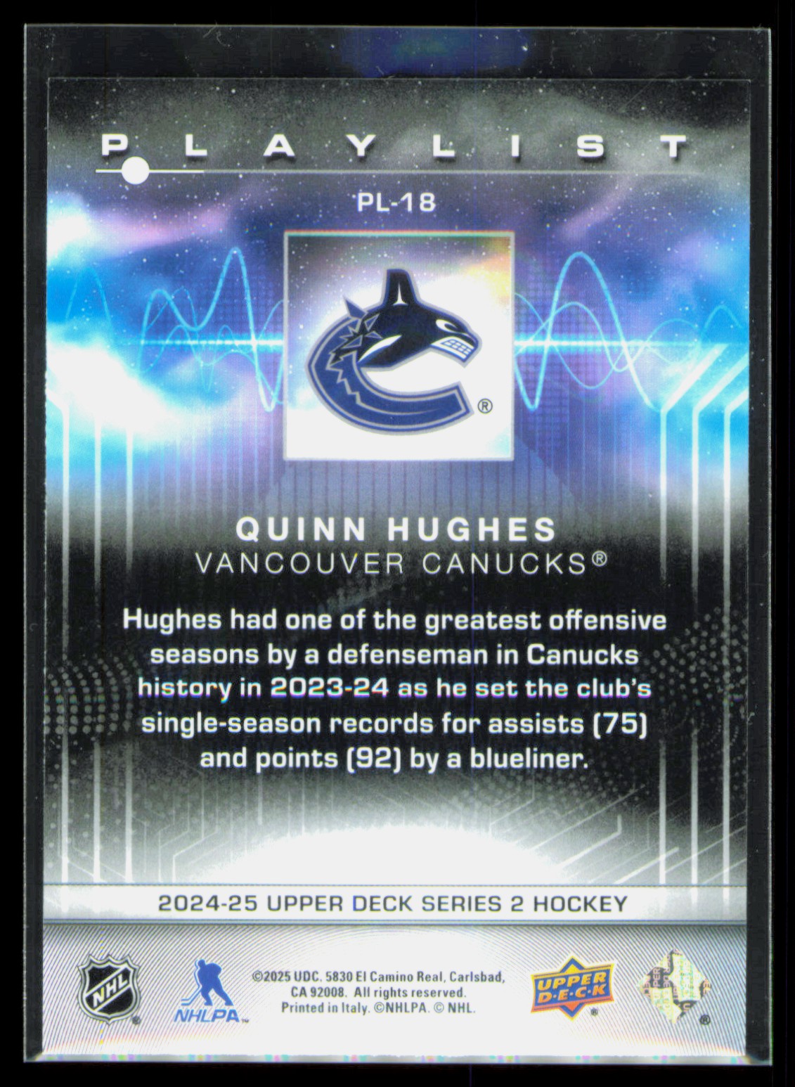 | 2024-25 Upper Deck Series 2 Playlist Quinn Hughes #PL-18 | ||||||||||||||||