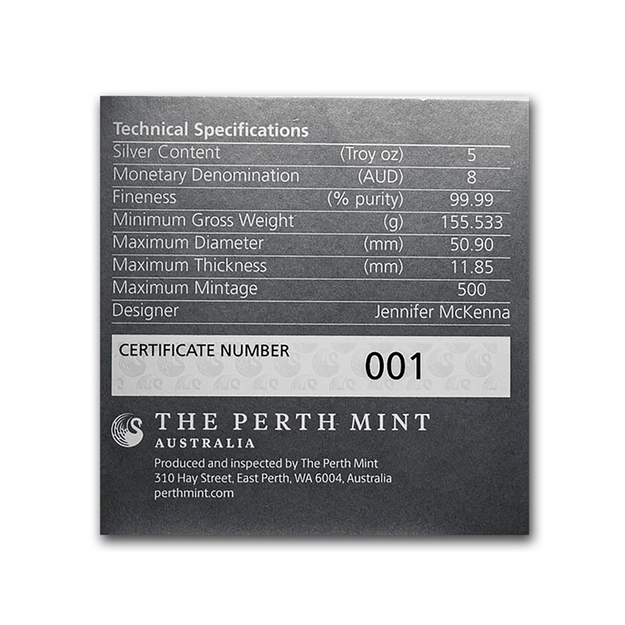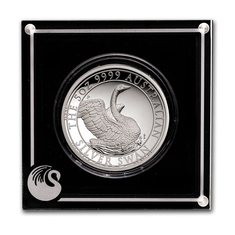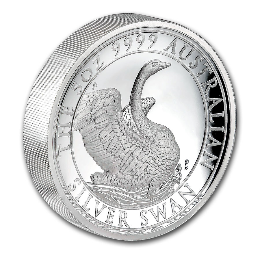 - Reverse: Portrays a swan landing on the water with its wings unfurled. The design also includes the description The 5 oz 9999 Australian Silver Swan and The Perth Mints P mint mark.