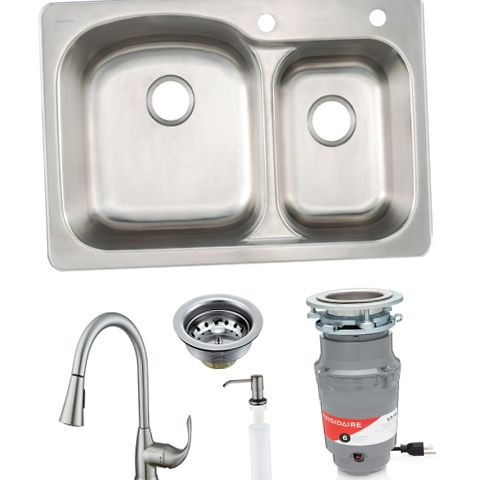 The Frigidaire AIO combination sink is a high-value, robust kit designed to help you easily upgrade your kitchen with a sink, faucet and food waste disposer. Made of stainless steel, this 18-gauge sink provides reliable use and wipes clean. The 60/40 dual bowl design makes it easy to wash dishes on the left and rinse on the right. The two-hole sink also includes a soap dispenser to keep the sink area tidy and efficient. The Frigidaire kitchen pull-down faucet set is engineered with the user in mind. It includes an anti-twist pull down hose with universal swivel ball joint. There’s no fuss or worry about having to untwist the hose after every use. The kitchen faucet includes a quick installation pull down hose and weight.