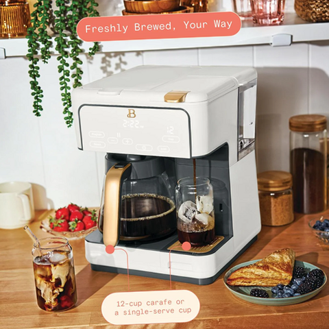 Experience the convenience and style of the Beautiful Multi-Brew Coffee Maker in White Icing, designed by Drew Barrymore. This coffee maker features multiple brewing options, allowing you to customize your coffee experience from rich espresso to classic drip coffee. Its user-friendly interface and durable construction make it ideal for both casual drinkers and coffee enthusiasts. The elegant white icing finish adds a touch of sophistication to your kitchen countertop. Enjoy consistent brewing quality and easy maintenance with this versatile appliance that caters to diverse coffee preferences.