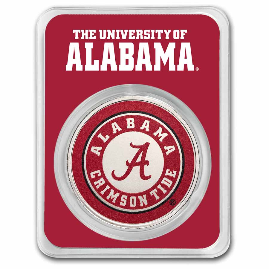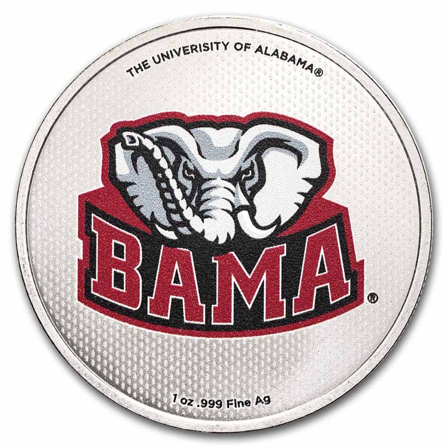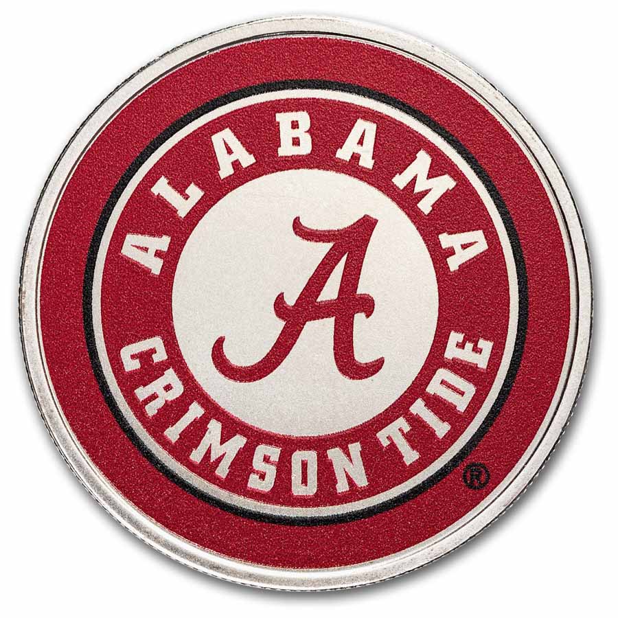 - Obverse: Features the iconic University of Alabama logo in script with Alabama Crimson Tide around the edges. Colorized in Crimson on a silver background.