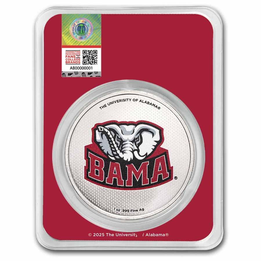 - Reverse: Showcases a colorized Big Al, the school's beloved elephant mascot above the letters BAMA on a silver background. The University of Alabama is inscribed at the top with the metal content, weight, and purity listed at the bottom.