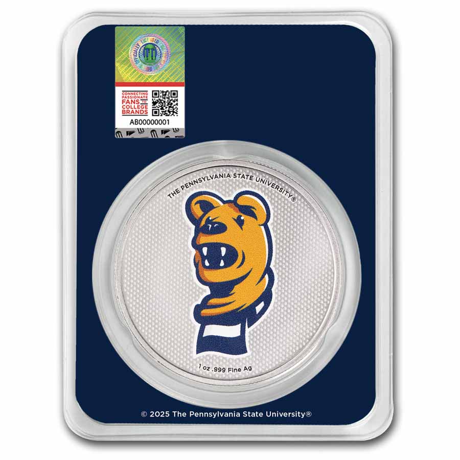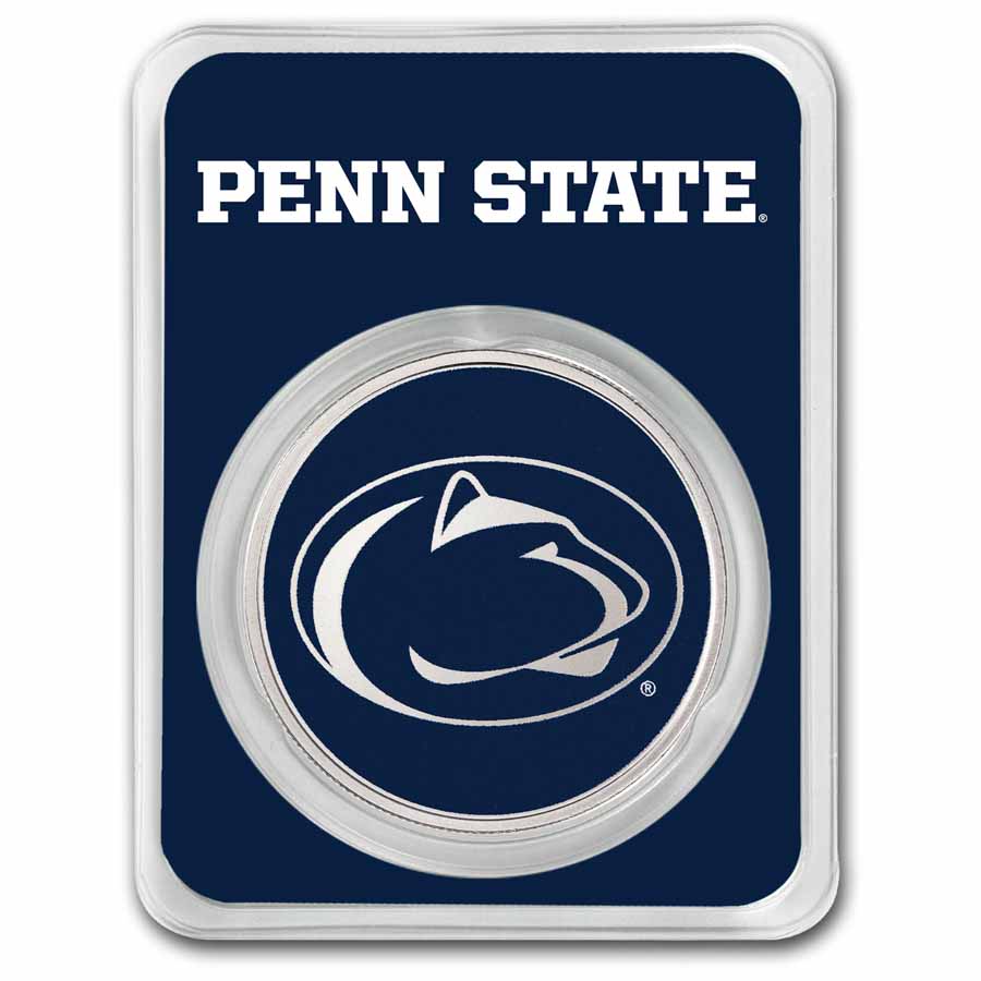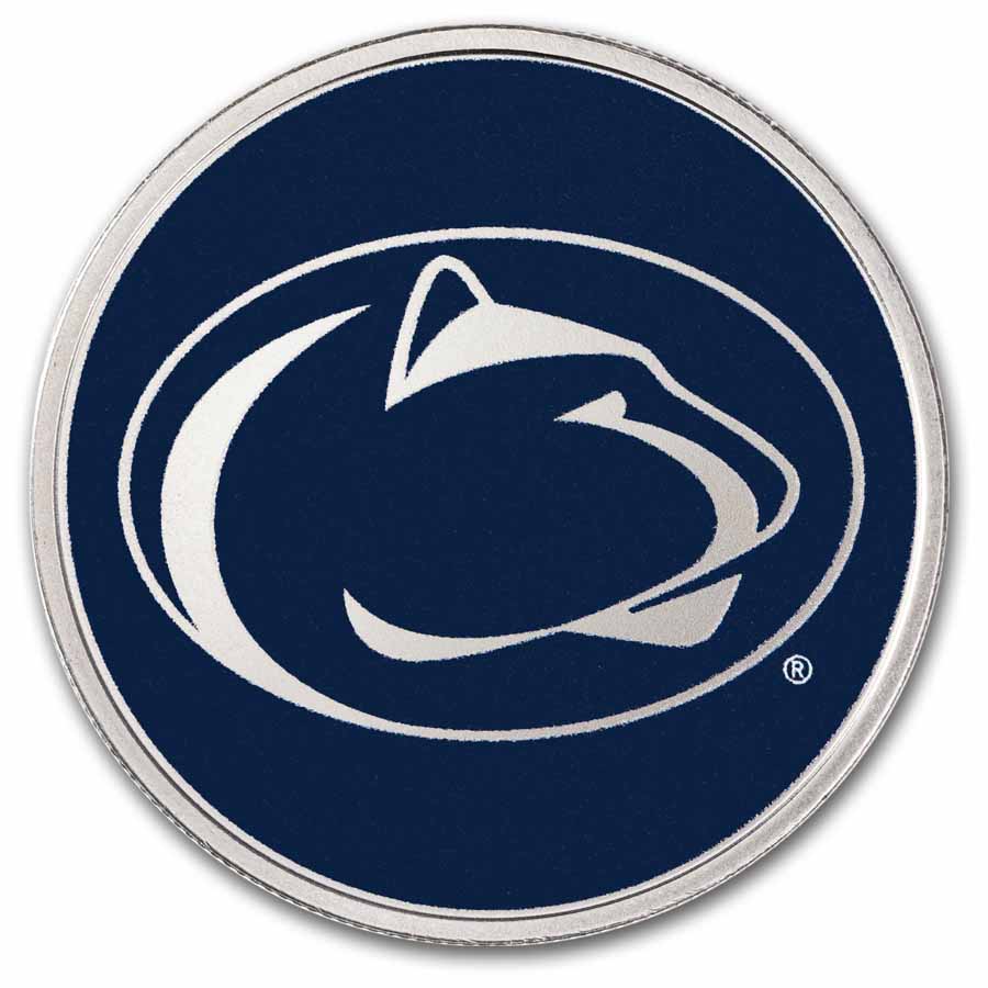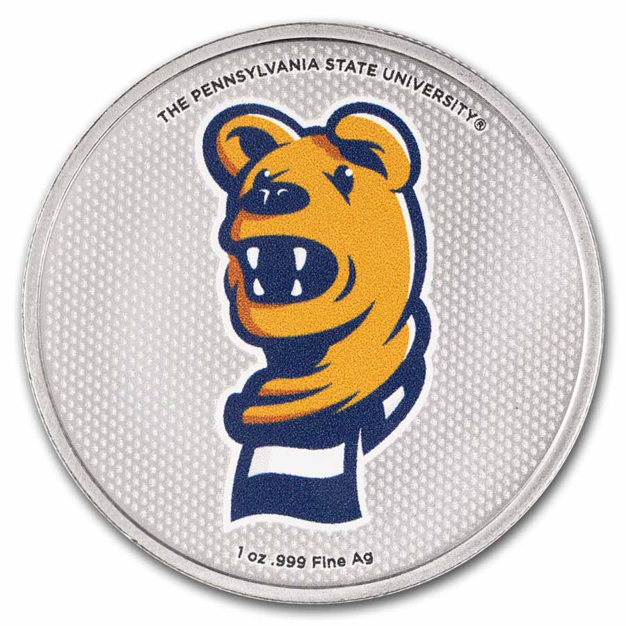 - Reverse: Showcases the face of the Nittany Lion mascot with his scarf in school colors on a silver background. Inscribed at the top is The Pennsylvania State University and the metal content, weight, and purity is listed at the bottom.