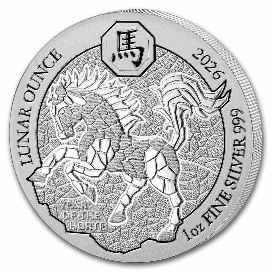 - Obverse: Features a mosaic image of a horse. The inscriptions Lunar Ounce, 2026, the Chinese sign for Horse and the purity are listed along the rim.