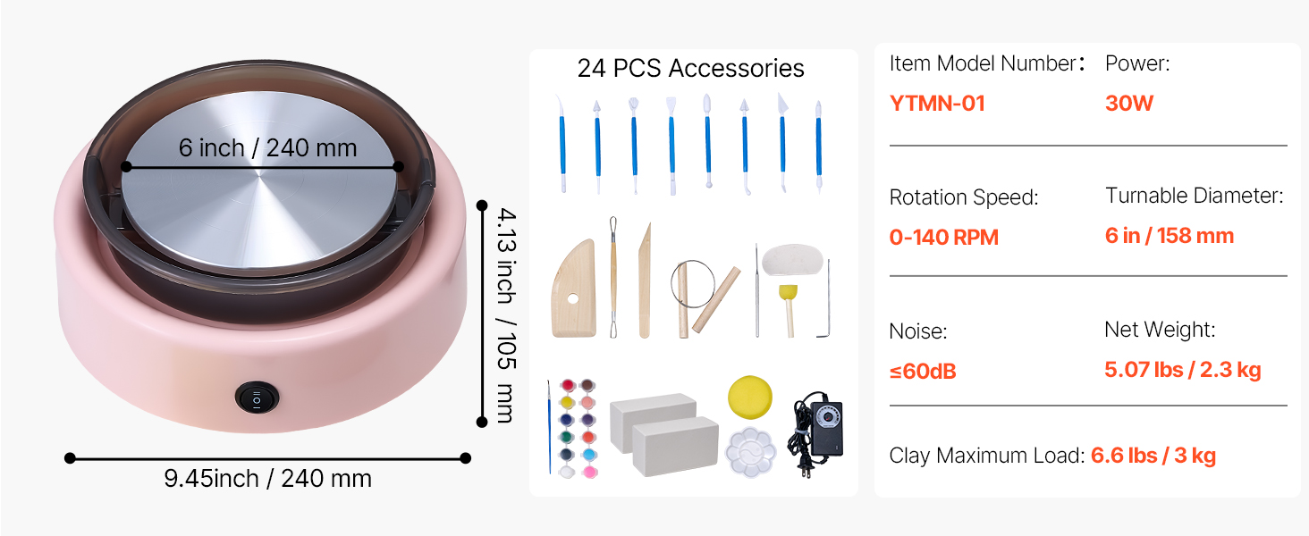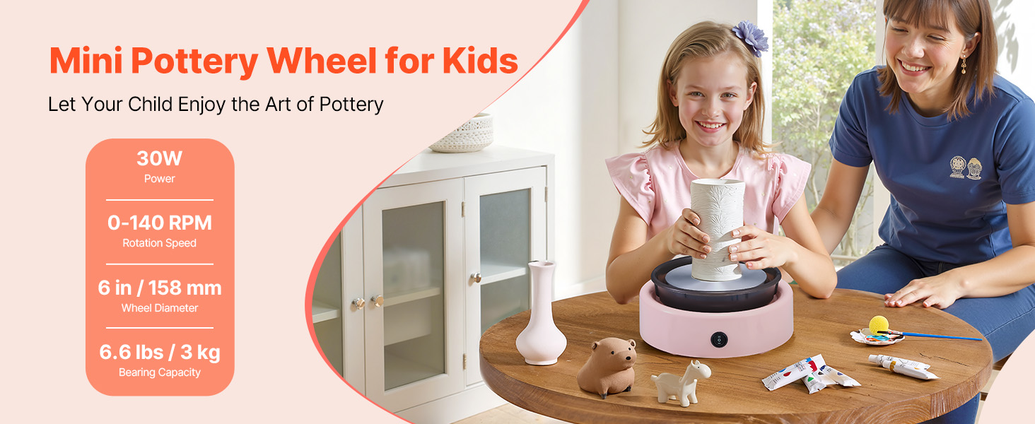 Mini Pottery Wheel for Kids: This portable mini pottery wheel features a powerful 30W motor and a sturdy 6 in aluminum turntable. It encourages creativity, imagination, and hands-on skills while enhancing parent-child bonding through artistic fun