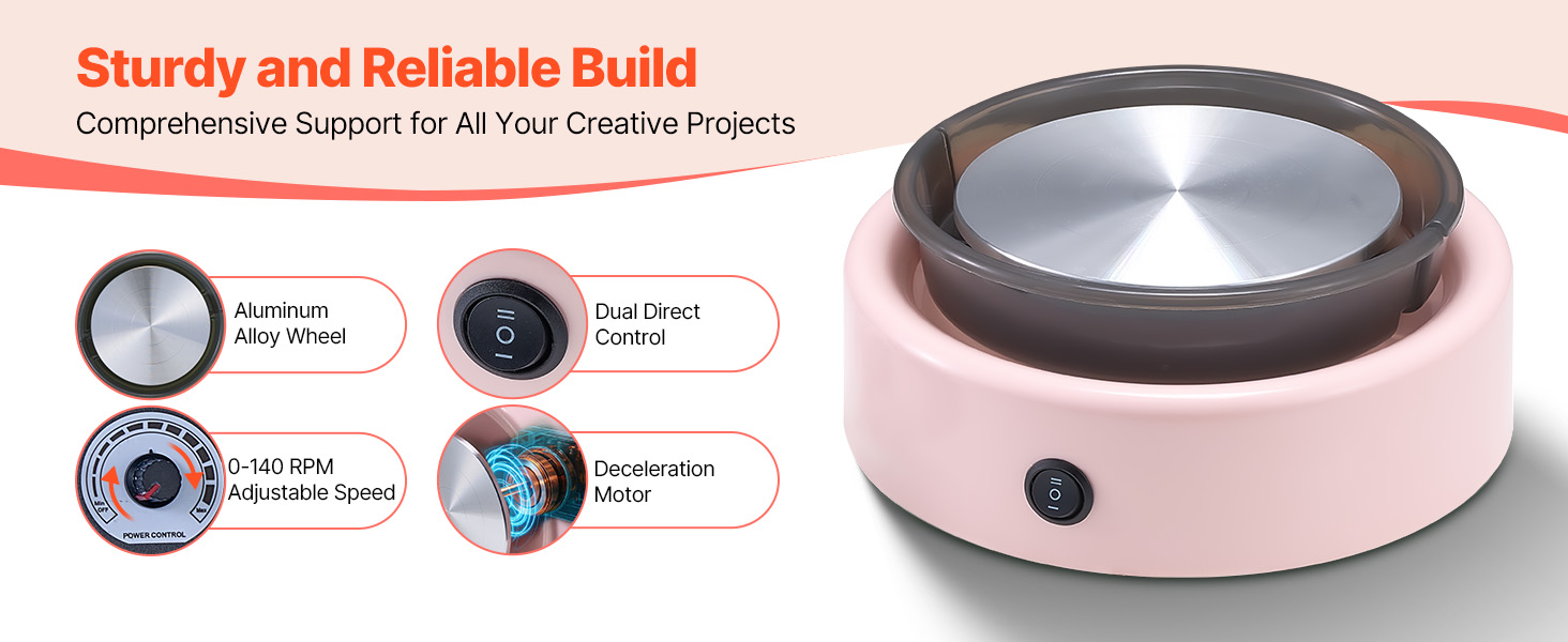 Smooth & Flexible Control: The clay wheel features easily 0–140 RPM speed control with a single knob. Switch between clockwise and counterclockwise spin to match different shaping styles. The quiet deceleration motor ensures smooth, focused crafting