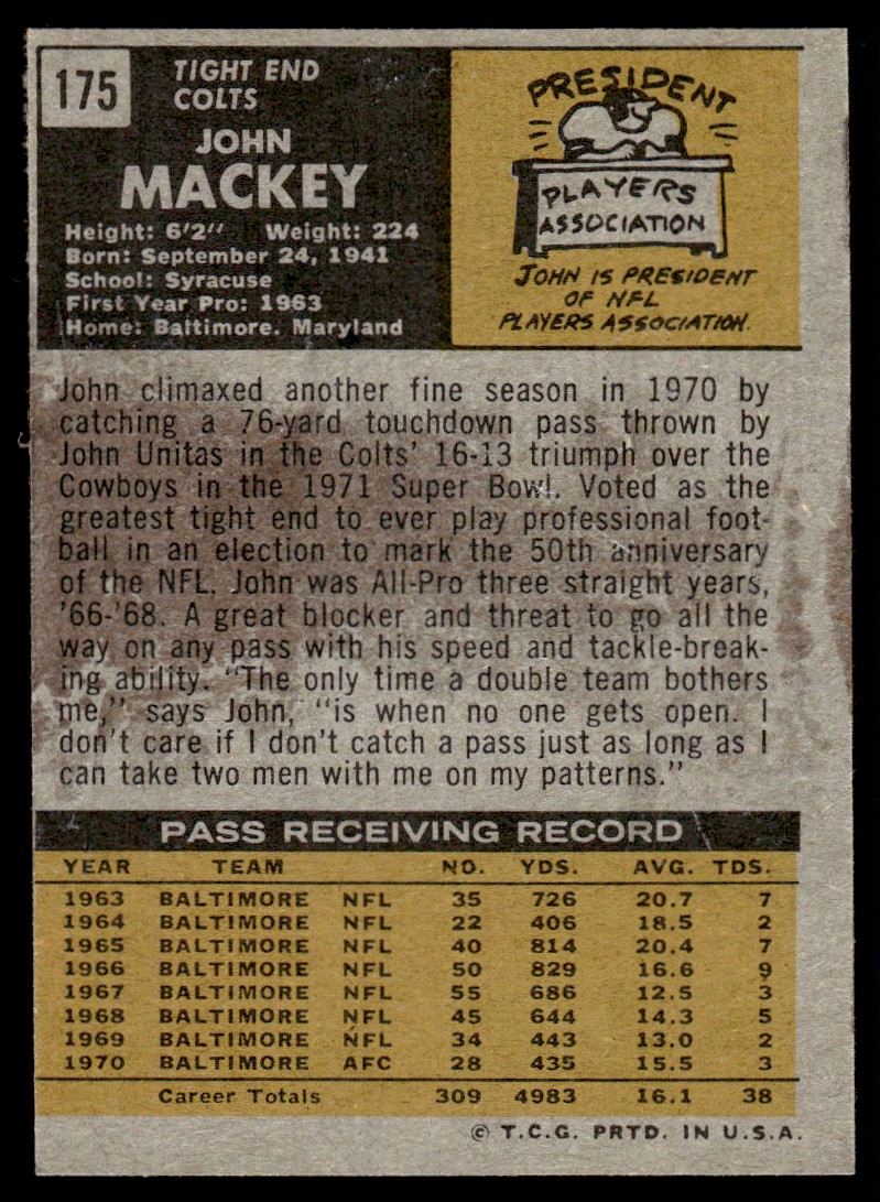 1971 Topps Nm Stain John Mackey Baltimore Colts #175