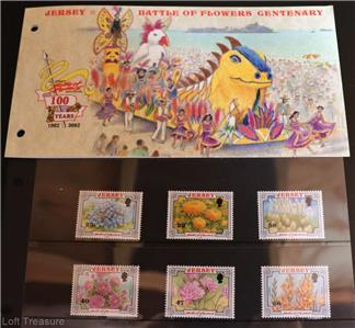 Mint Condition: The MNH loose stamps are backed by black card and covered with a plastic film from which they can easily be removed. This is housed in a folded card sleeve (as seen at top of photograph) Both the picture card sleeve and the inner card have two hole punches to the left side carried out by JERSEY POST OFFICE PHILATELIC BUREAU so that the pack can be stored in a binder.