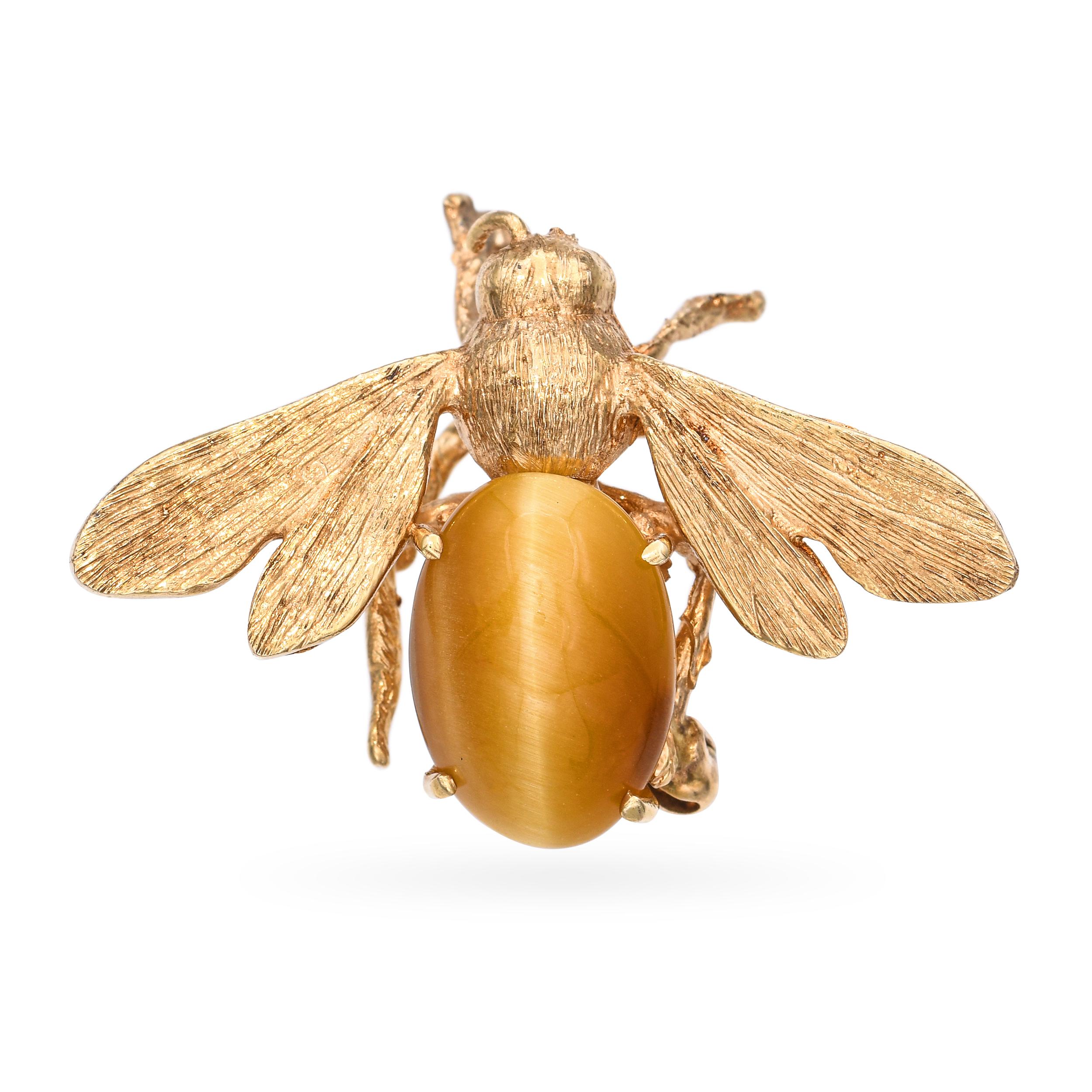 Vintage 14k Yellow Gold Tigers Eye Bumblebee Brooch
