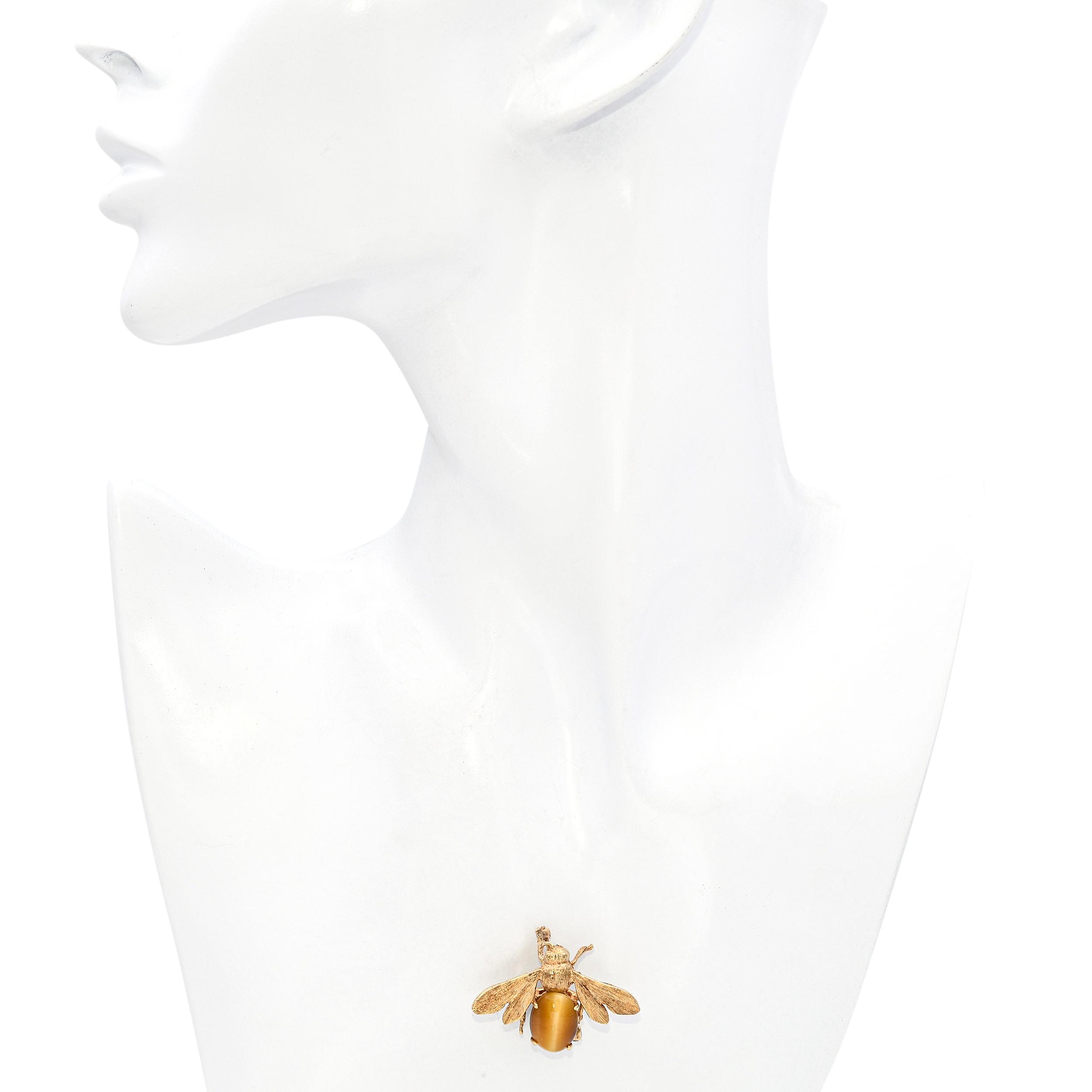 This charming vintage brooch is crafted in 14k yellow gold and designed in the whimsical form of a bumblebee. The body is set with polished tiger’s eye, showcasing its warm golden-brown chatoyancy that mimics the natural stripes of a bee. Fine gold detailing highlights the wings and legs, adding depth and texture to the design. Playful yet elegant, it’s a versatile piece that can add personality to any outfit. A delightful vintage accessory that combines natural gemstone beauty with creative craftsmanship.