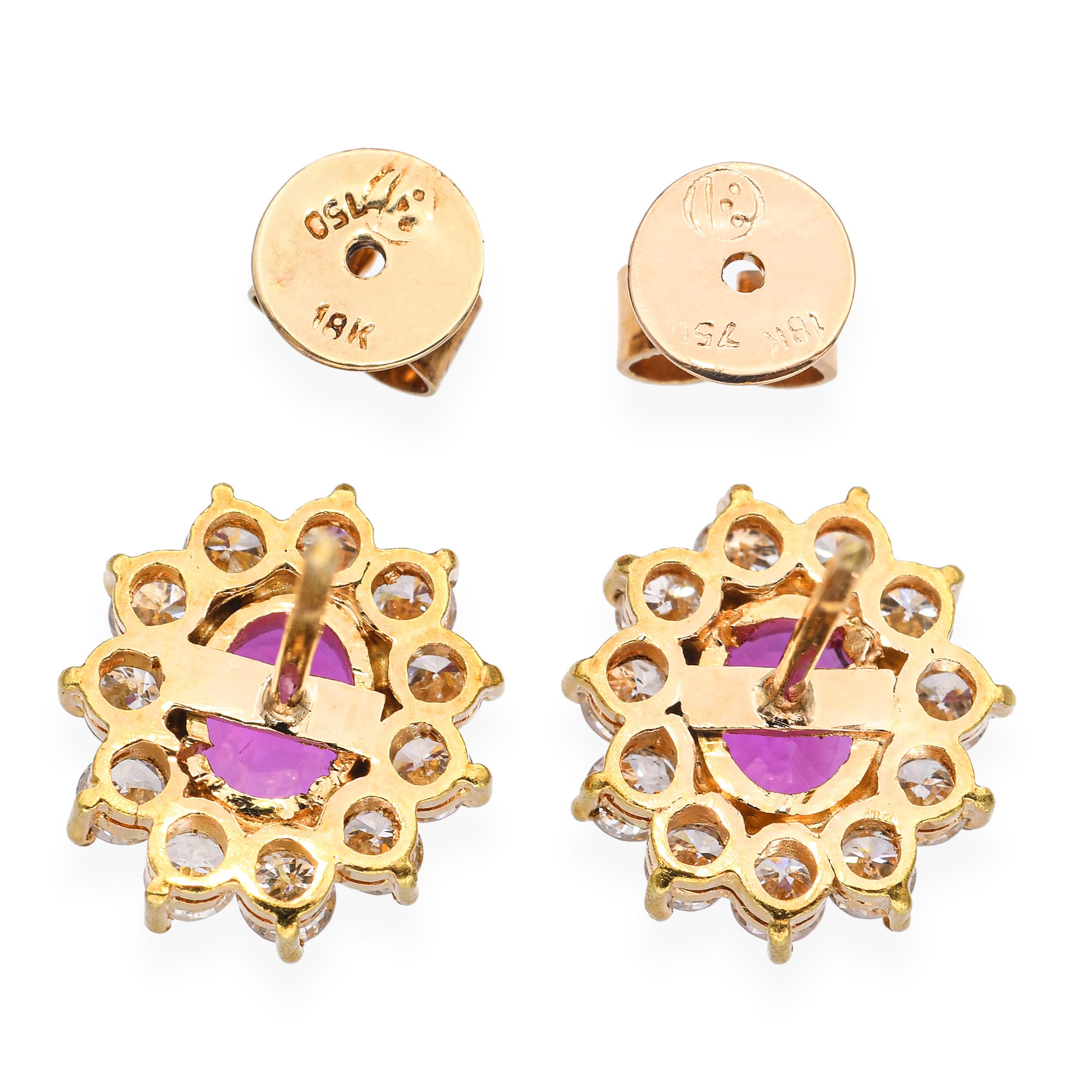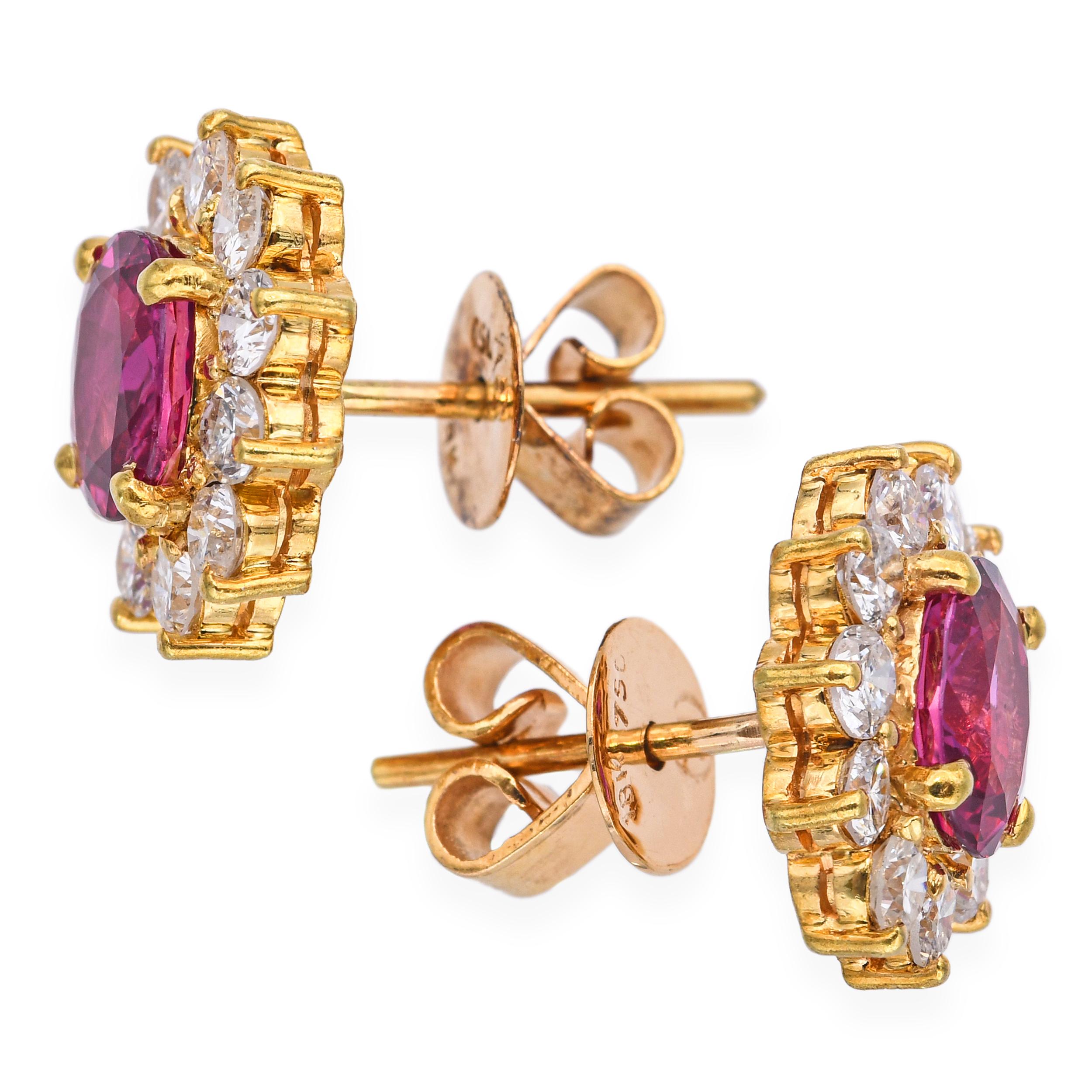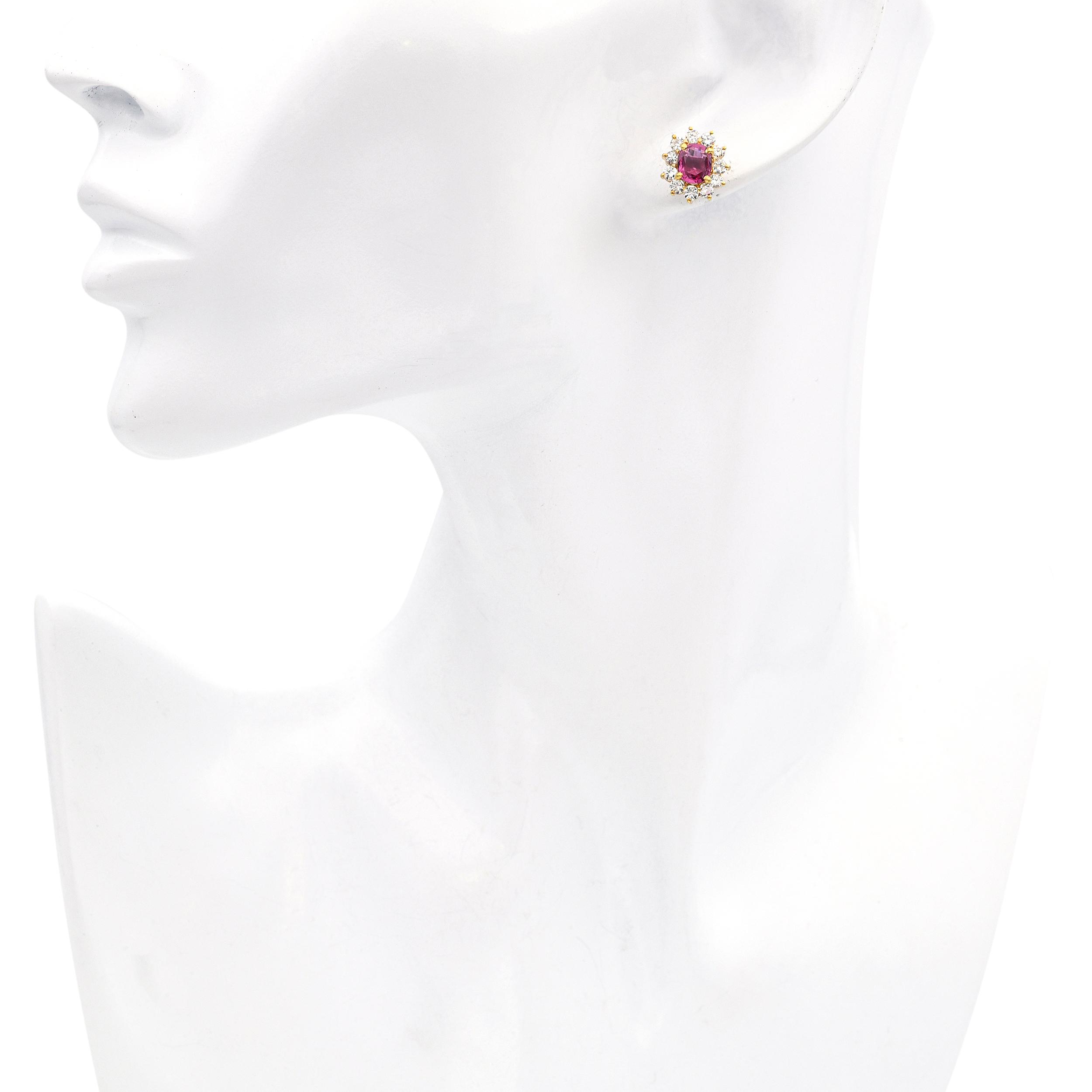 These luxurious vintage stud earrings are crafted in 18k yellow gold and feature 2.01 total carats of vibrant rubies as the focal point. Surrounding each ruby is a halo of sparkling diamonds totaling 0.66 carats, adding brilliance and enhancing the rich red color. The warm gold setting beautifully contrasts with the gemstones, creating a timeless and elegant design. Perfectly sized for both everyday wear and special occasions, they offer a refined pop of color and sparkle. A classic vintage pair that combines sophistication with bold gemstone beauty.