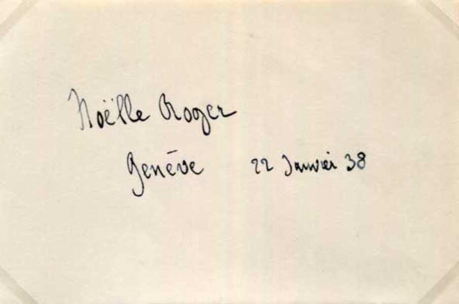 Signed album page, 4 x 2,75 inch, Geneva, 22.01.1938, signed and dated in dark ink "Noëlle Roger - Geneve 22 Janvier 38", attractively mounted (removable) for fine display with a photograph, shows Noëlle Roger in a 2/3 length pose (altogether 8,25 x 11,75 inch), in very fine condition.