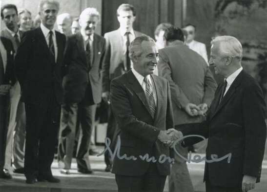 Signed photograph, shows Shimon Peres during a meeting with Richard von Weizsäcker (11.10.1985), 7,5 x 5,5 inch, signed in silver felt tip "Shimon Peres", slightly trimmed to the lower edge - in nearly very fine condition.