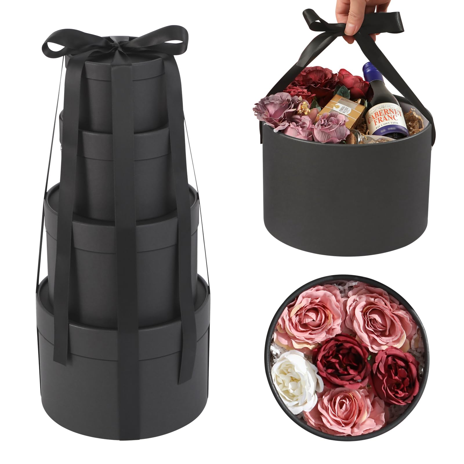 Round Gift Boxes with Lids Set of 4, Luxury Gift Boxes with Ribbons Assorted Sizes, Nesting Gifts Boxes for Flowers Arrangements, Bridesmaid, Proposal, Wedding, Birthday, Party (Matte Black)