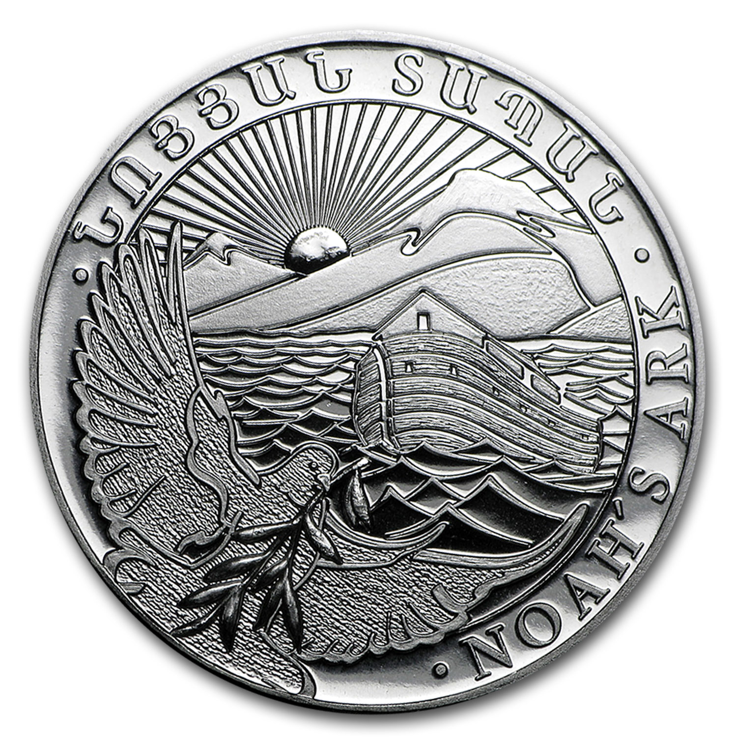 - Reverse: Designed by Eduard Kurghinyan and displays a dove in flight with an olive branch and Noahs Ark floating on the flood waters in front of Mt. Ararat as the sun rises.