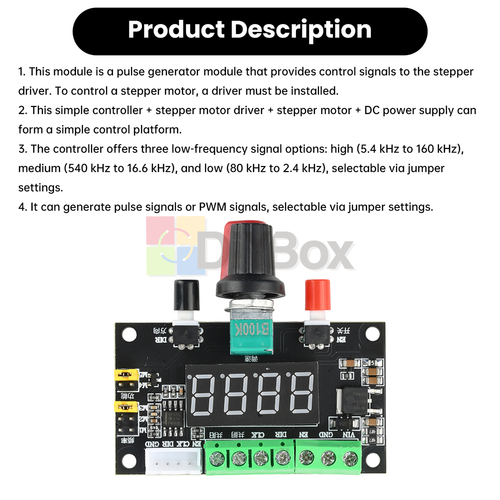 4. It can generate pulse signals or PWM signals, selectable via jumper settings.