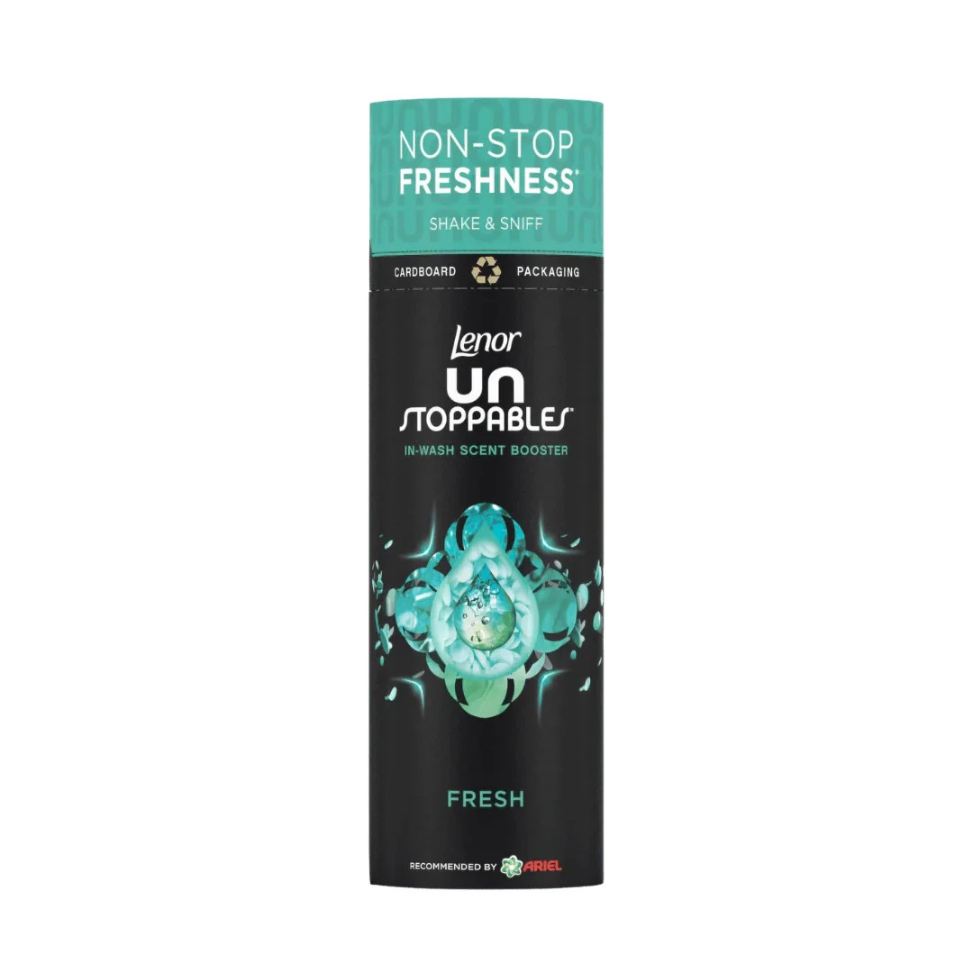 Discover Lenor Unstoppables in wash scent booster, formulated with long lasting freshness technology, to provide your laundry with a boost of non stop freshness up to 12 weeks in storage. Lenor scent experts recommend Unstoppables Fresh if you are looking for a sparkling citrus and juicy fruits scent wrapped into transparent floral notes. Available in different scents, each Lenor Unstoppables fragrance injects freshness into every wash! Add it to every wash on top of your usual laundry routine. Lenor scent boosters come in a moisture resistant cardboard pack.
