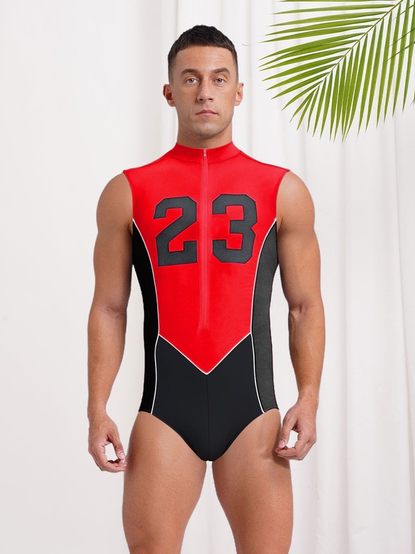 Men Jumpsuit Breathable Leotard Number Printed Unitard Front Zipper Bodysuit