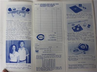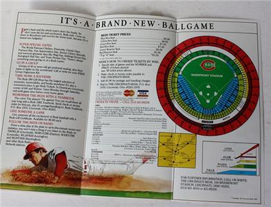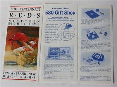 Here is a great lot of 2 Cincinnati Reds 1 1985 Ticket Flyer with Pete Rose on front and the other 580 Gift Shop Flyer with items and prices Riverfront Stadium Awesome item. The 1985 Flyer measures 4 X 8 3/4 and the 580 Gift Shop 7 1/2 X 9 inches and folds out. Grab this great collectibles set while you still can.