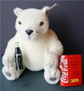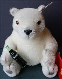 Here is a great Steiff Original Teddy Bear 2000 Limited Edition Beautiful White Polar Bear sitting down with white tag and hang tag holding a Coca Cola Bottle. It is Adorable. It is marked with tags-SEE ALL PHOTOS! It measures about 7 inches tall by about 6 inches wide. Grab this vintage collectible while you still can it will not last long!