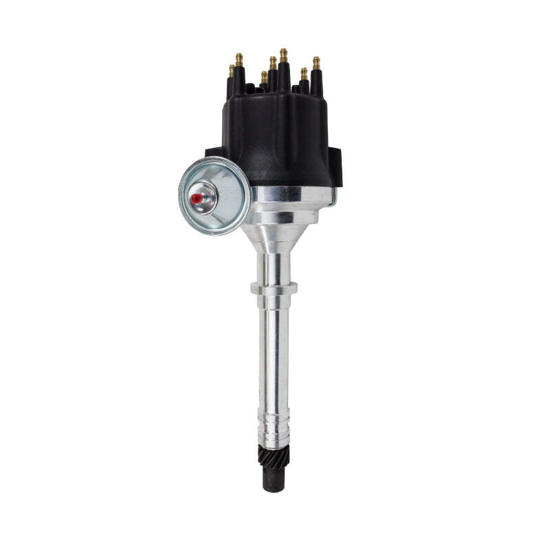 TSP Pro Series Ready to Run Distributor is perfect for a street performance upgrade. It features a CNC-machined billet aluminum body and hardened steel shaft, with a sealed ball bearing on top and a sintered steel bushing on the bottom. It also comes with a fully adjustable mechanical advance, vacuum advance, magnetic pickup trigger, and a high-output circuit board module with digital tach output. The dielectric cap comes with solid brass terminals and a color-matched wire retainer.