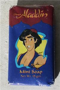 Here is a great sealed Aladdin Miniature Soap bar with great photo of Aladdin on front. It is Awesome. It is sealed does have some scuffs on corners and edges-SEE ALL PHOTOS. It measures about 2 1/2 inches tall by about 1 1/4 inch wide. Grab this great little vintage collectible while you still can it will not last long.