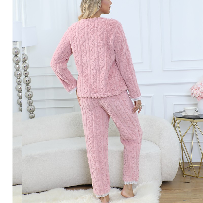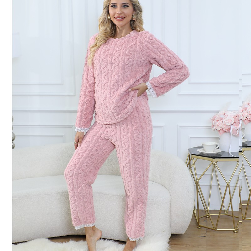 Winter Cozy Pajamas Set Women Pyjamas Flannel Warm Long Pants Lace Sleepwear