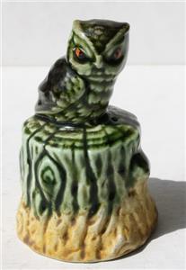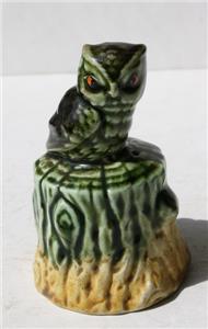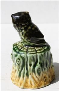 Here is a great vintage ceramic-porcelain hand painted Green Wise old Owl Figurine sitting on top of a tree stump bell but it doe not have the bell ringer. It is Adorable. It is unmarked. It measures about 3 1/2 inches tall and 2 inches wide. Grab this great Wise Old Owl Figure Bell collectible while you still can it will not last long.