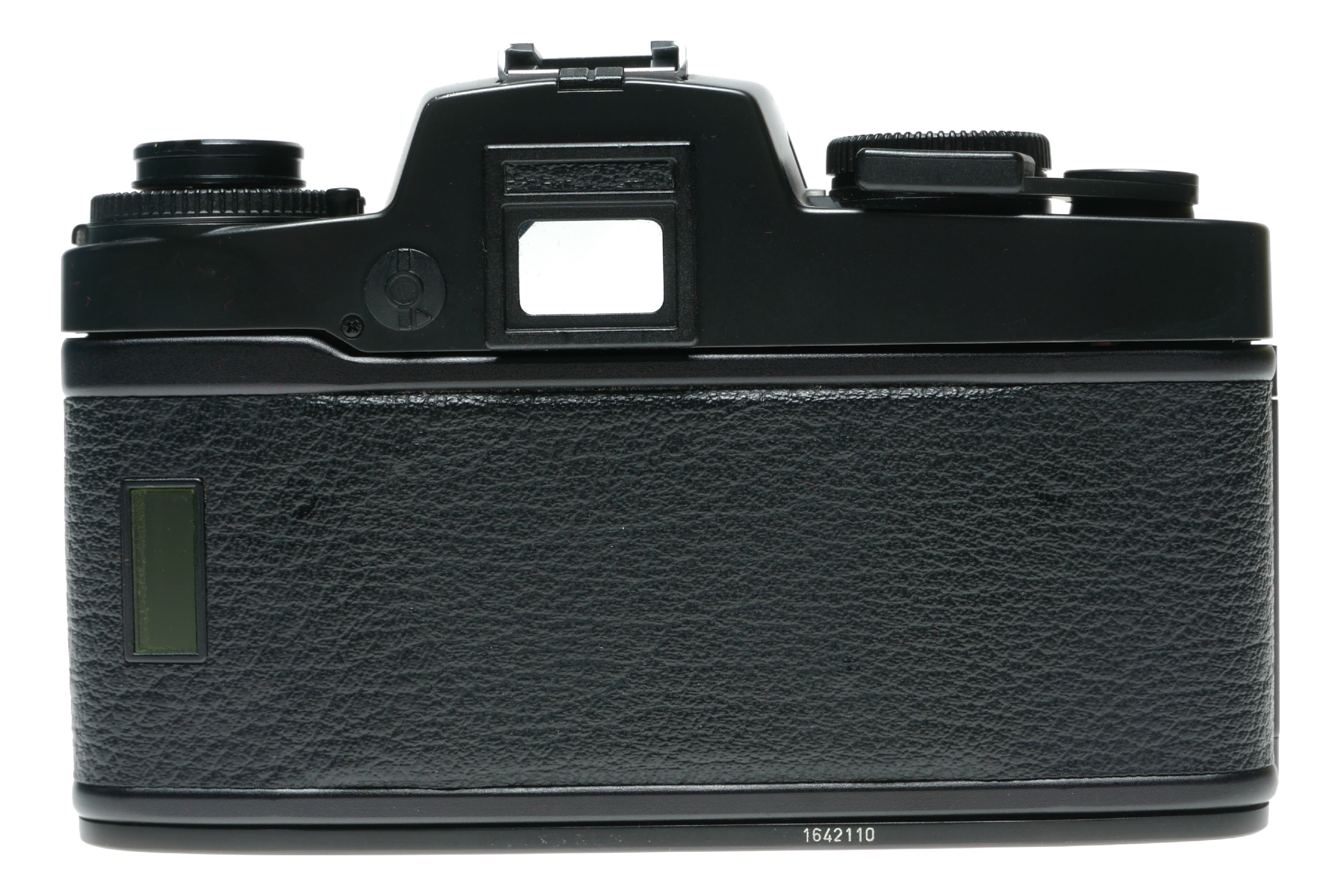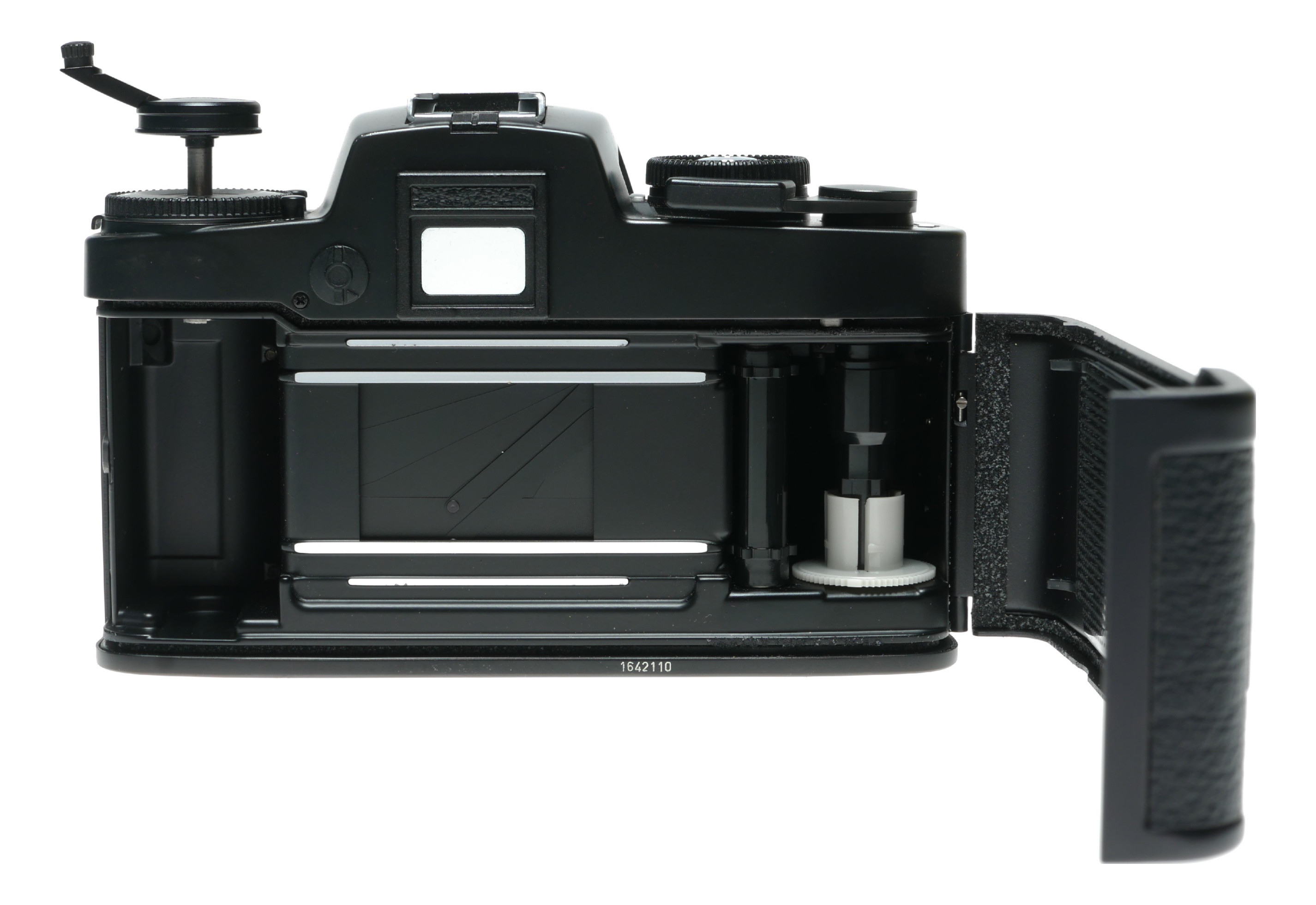 Condition Report: This camera body is in excellent, near-mint condition. The black finish shows no significant cosmetic wear, with only the lightest scuffs or marks. The film compartment is clean, and the shutter is fully functional at all speeds. The exposure meter responds correctly. All dials and buttons turn smoothly and click satisfyingly into place. The original box and manual are also in excellent condition, indicating this camera was very well cared for.