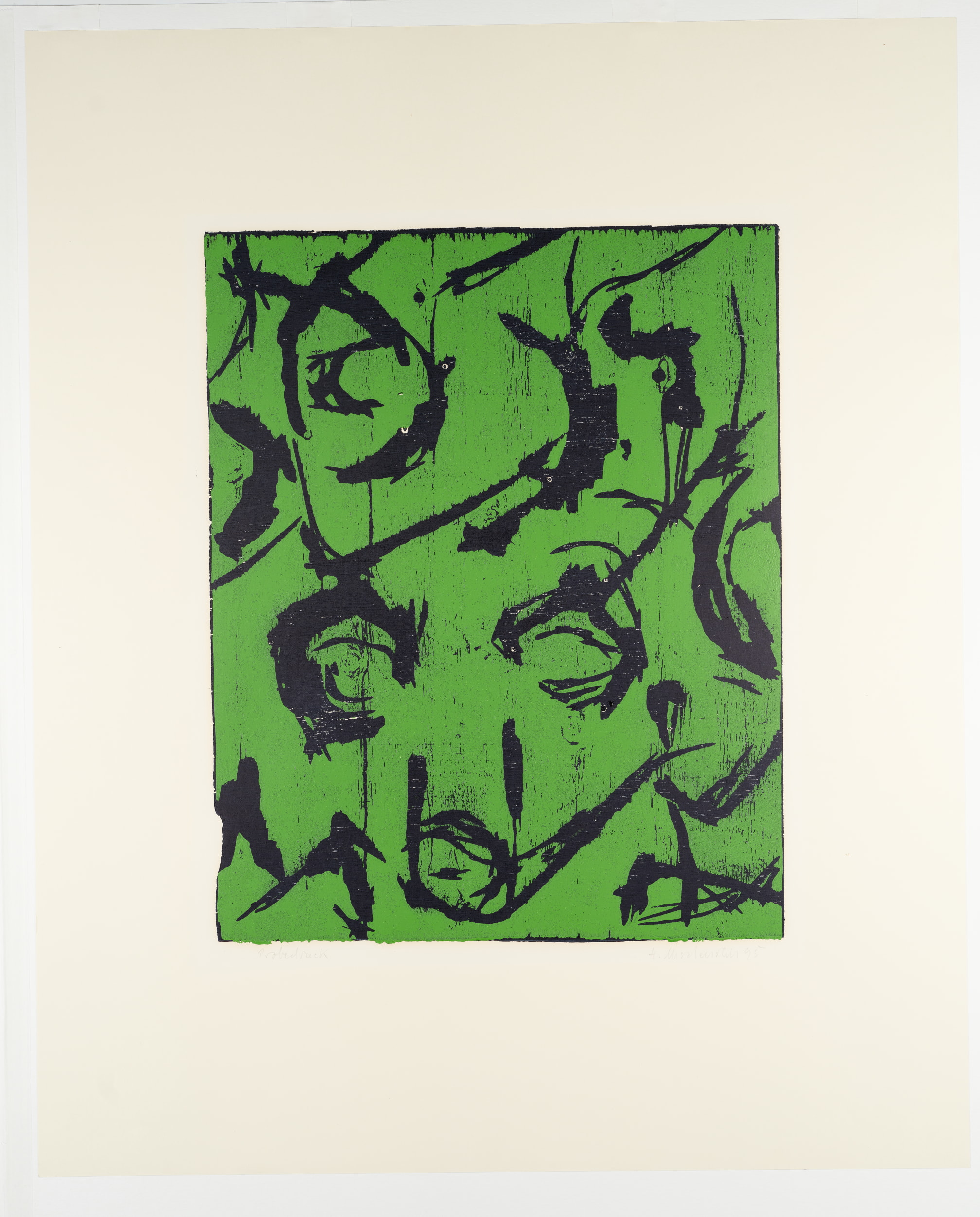 Heinrich Modersohn (*1948 Hindelang), Abstrakte, schwarze Gesichter auf grünem Hintergrund, 1995, Farbholzschnitt