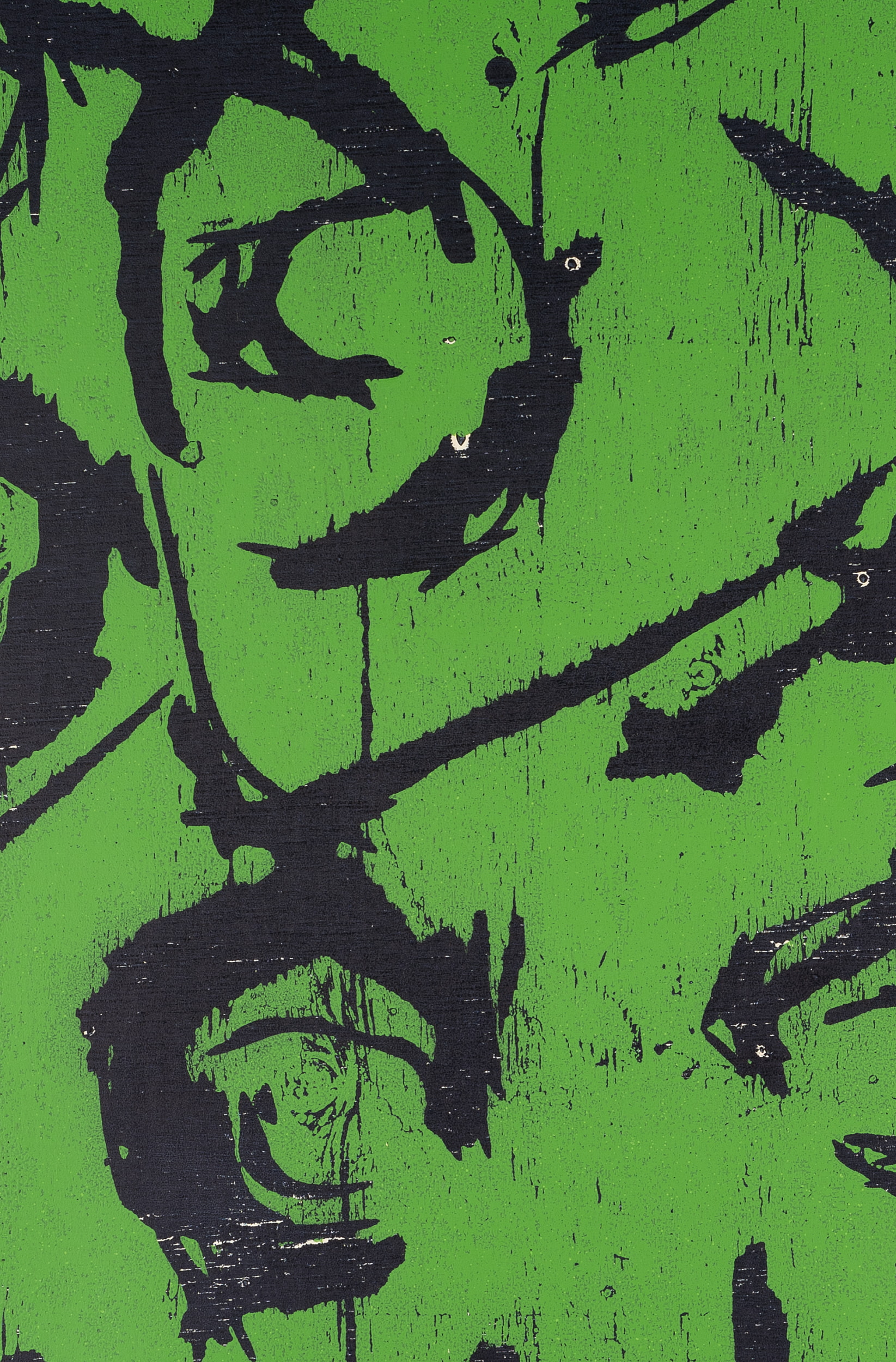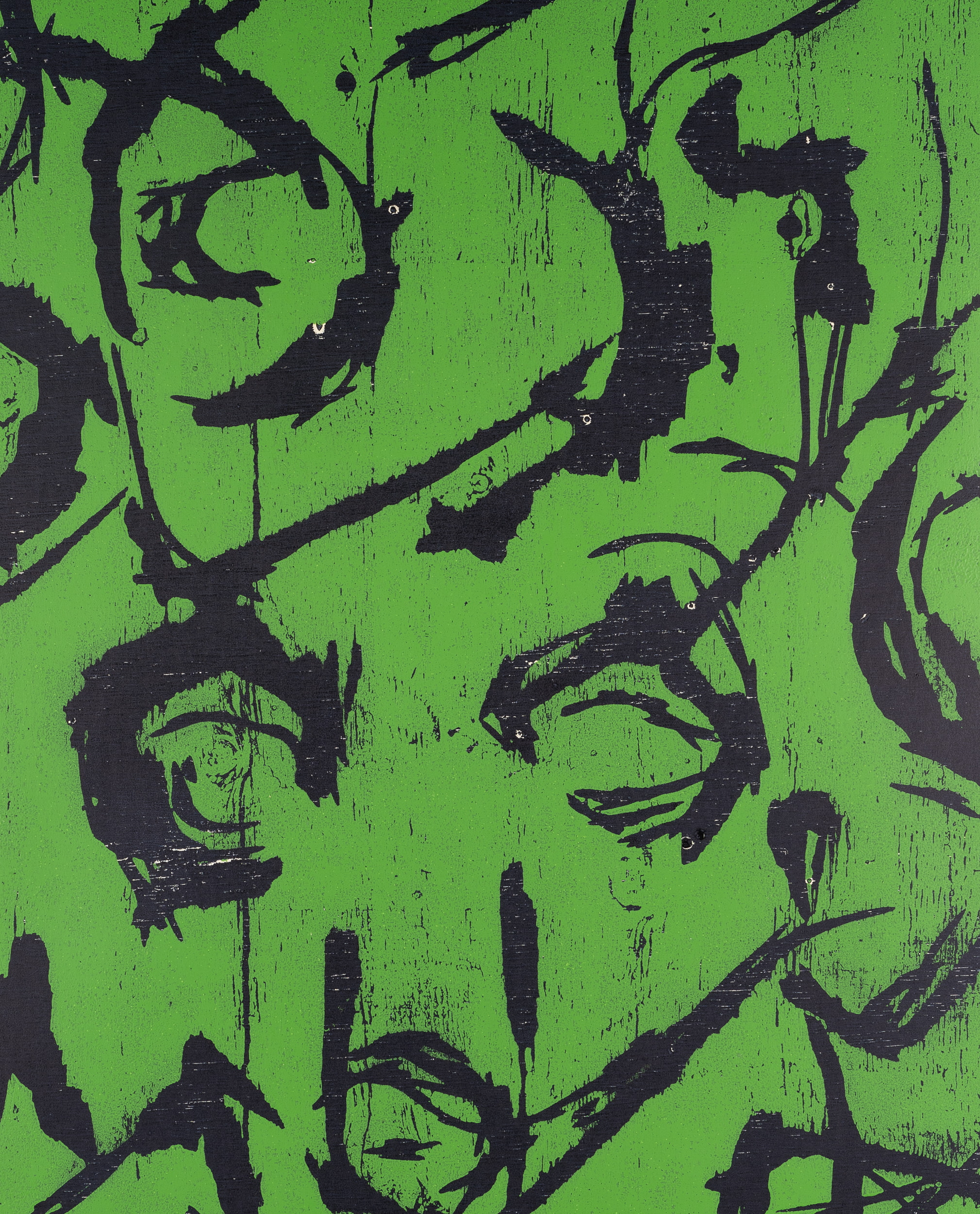 Heinrich Modersohn (born 1948 Hindelang), Abstract, black faces on a green background, 1995, Color woodcut