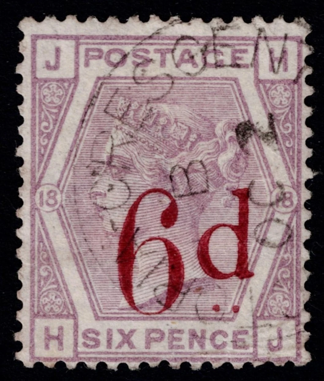 A very fine 6d on 6d Lilac SG 182, from plate 18, lettered HJ and cancelled by a light CDS. Cat. £75.00